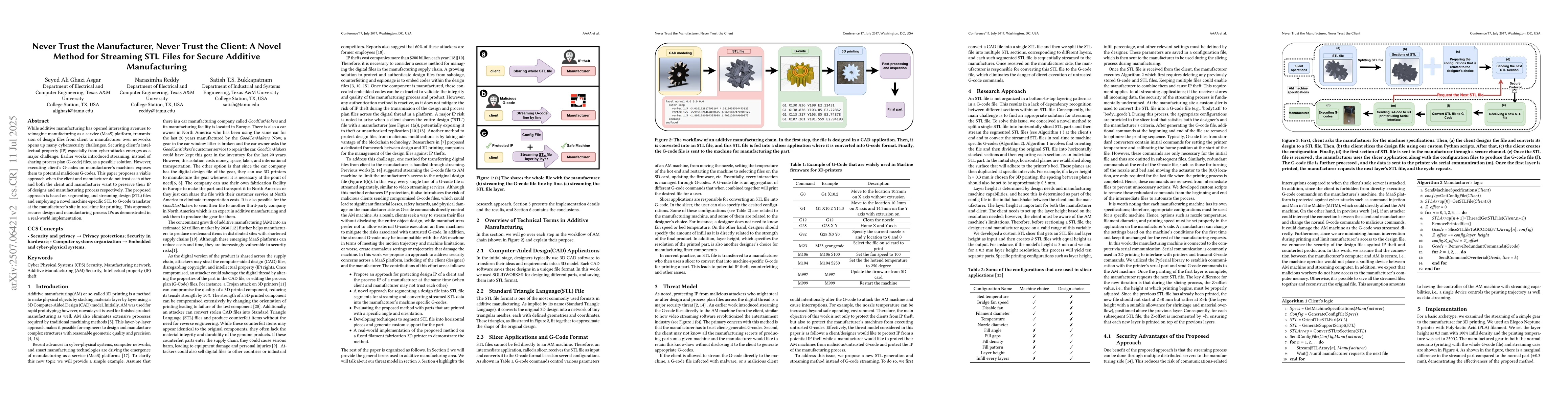 While additive manufacturing has opened interesting avenues to reimagine manufacturing as a service (MaaS) platform, transmission of design files from client to manufacturer over networks opens up many cybersecurity challenges. Securing client's intellectual property (IP) especially from cyber-attacks emerges as a major challenge. Earlier works introduced streaming, instead of sharing process plan (G-code) files, as a possible solution. However, executing client's G-codes on manufacturer's machines exposes them to potential malicious G-codes. This paper proposes a viable approach when the client and manufacturer do not trust each other and both the client and manufacturer want to preserve their IP of designs and manufacturing process respectively. The proposed approach is based on segmenting and streaming design (STL) files and employing a novel machine-specific STL to G-code translator at the manufacturer's site in real-time for printing. This approach secures design and manufacturing process IPs as demonstrated in a real-world implementation.