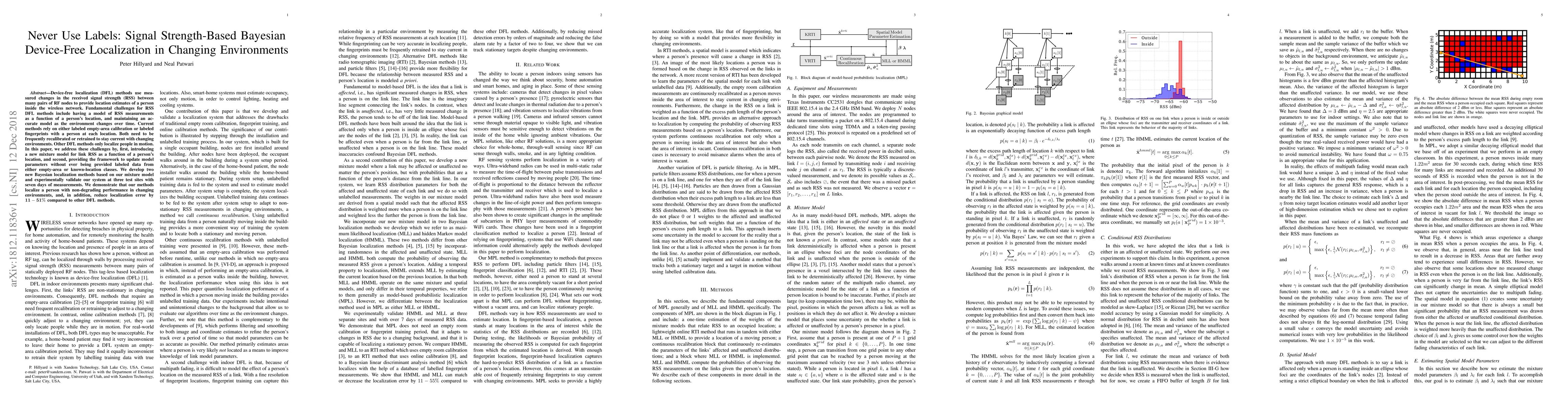 This paper introduces a novel signal strength-based Bayesian device-free localization method that updates its model parameters without requiring labeled data, addressing the challenges of maintaining accuracy in changing environments. The proposed mixture model and Bayesian localization methods show improved performance and reduced localization error compared to existing methods.
