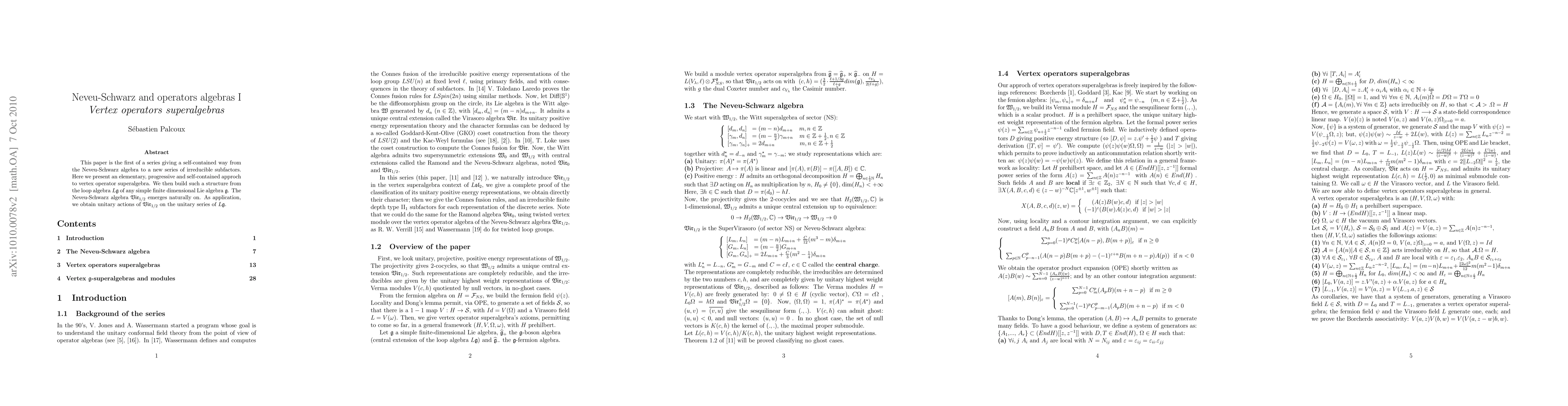 This paper is the first of a series giving a self-contained way from the Neveu-Schwarz algebra to a new series of irreducible subfactors. Here we present an elementary, progressive and self-contained approch to vertex operator superalgebra. We then build such a structure from the loop algebra $Lg$ of any simple finite dimensional Lie algebra $g$. The Neveu-Schwarz algebra $Vir_{1/2}$ emerges naturally on. As application, we obtain a unitary action of $Vir_{1/2}$ on the unitary discrete series of $Lg$.