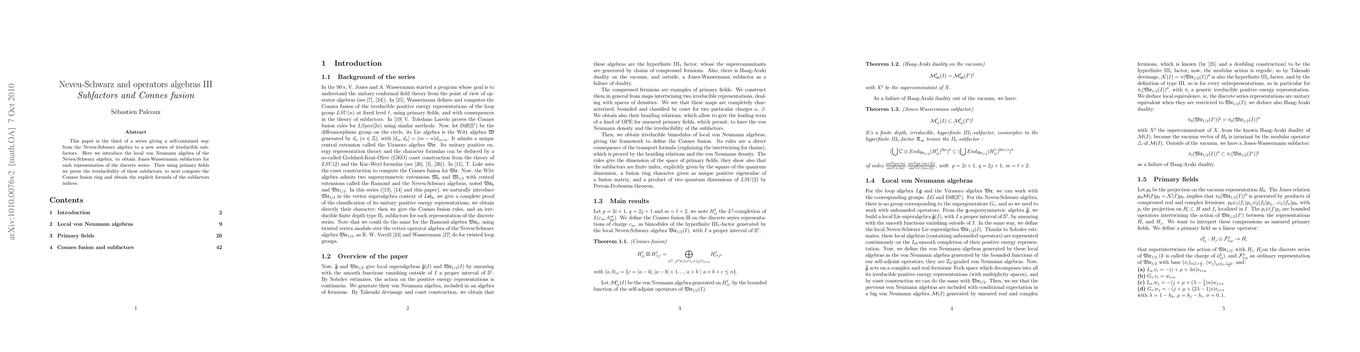 This paper is the third of a series giving a self-contained way from the Neveu-Schwarz algebra to a new series of irreducible subfactors. Here we introduce the local von Neumann algebra of the Neveu-Schwarz algebra, to obtain Jones-Wassermann subfactors for each representation of the discrete series. Then using primary fields we prove the irreducibility of these subfactors; to next compute the Connes fusion ring and obtain the explicit formula of the subfactors indices.