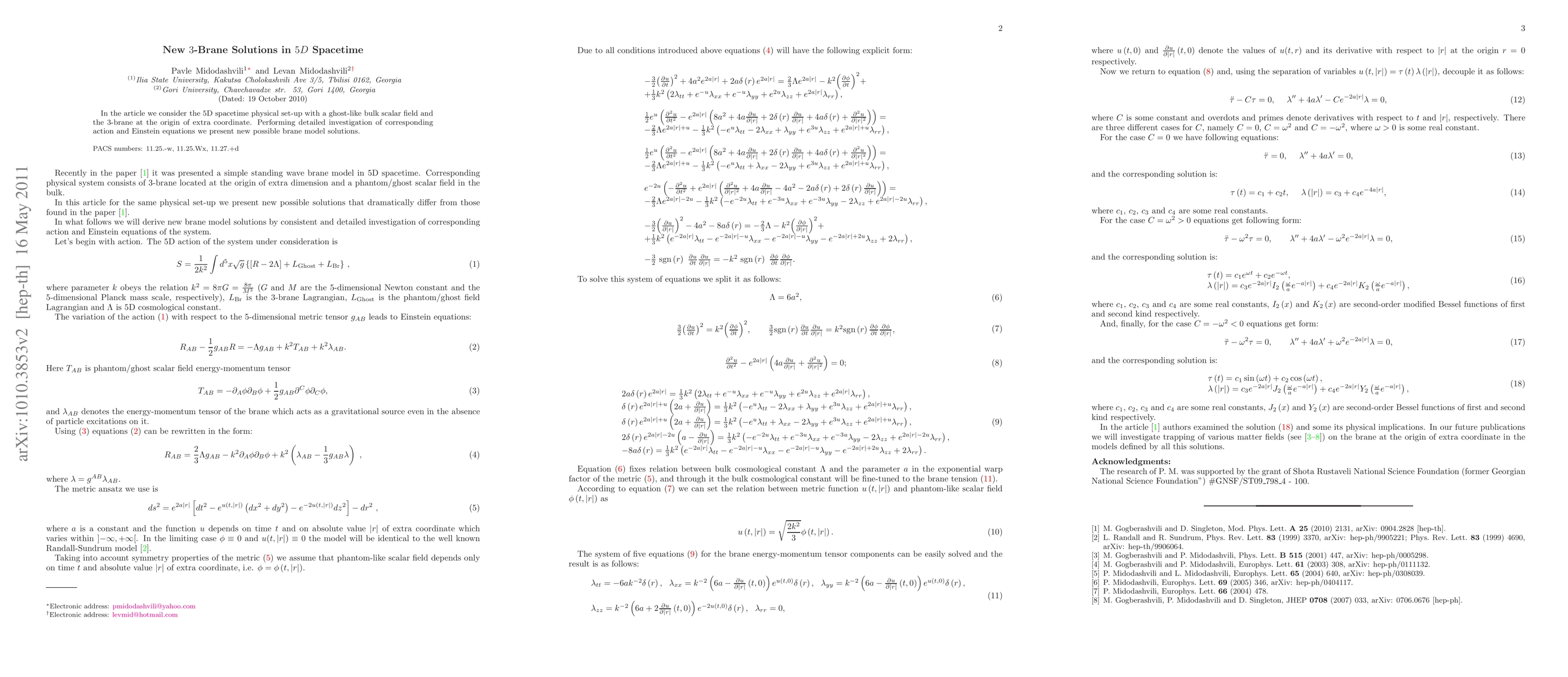 This paper presents novel brane model solutions in 5D spacetime, utilizing a ghost-like bulk scalar field and positioning the 3-brane at the origin of the extra dimension. These findings offer new insights into the structure of higher-dimensional theories.