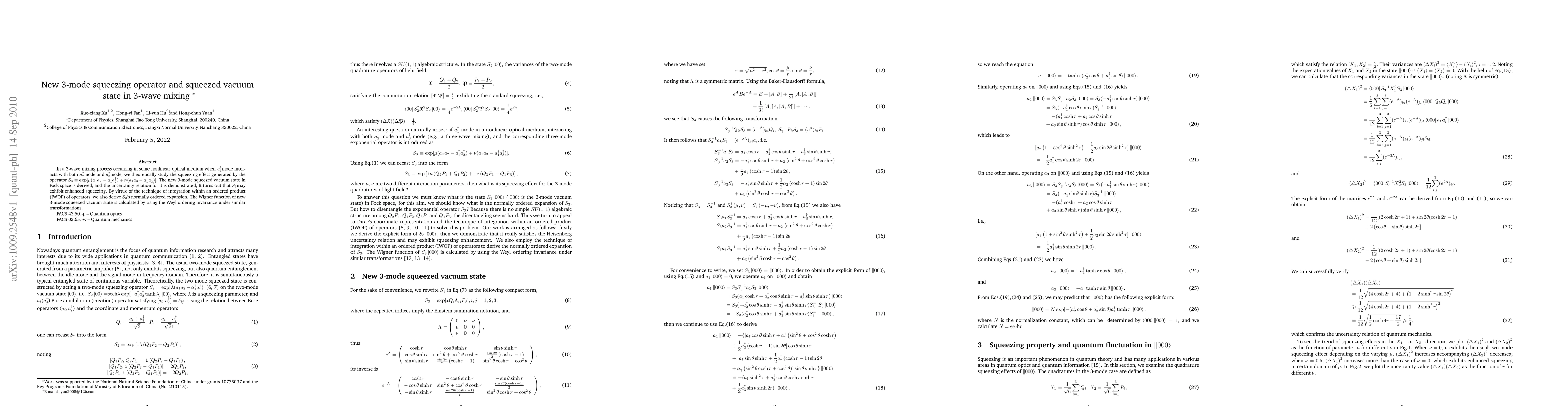 The paper presents a novel 3-mode squeezing operator (S3) and derives the corresponding 3-mode squeezed vacuum state, along with its normally ordered expansion and Wigner function, using the integration within an ordered product (IWOP) technique.