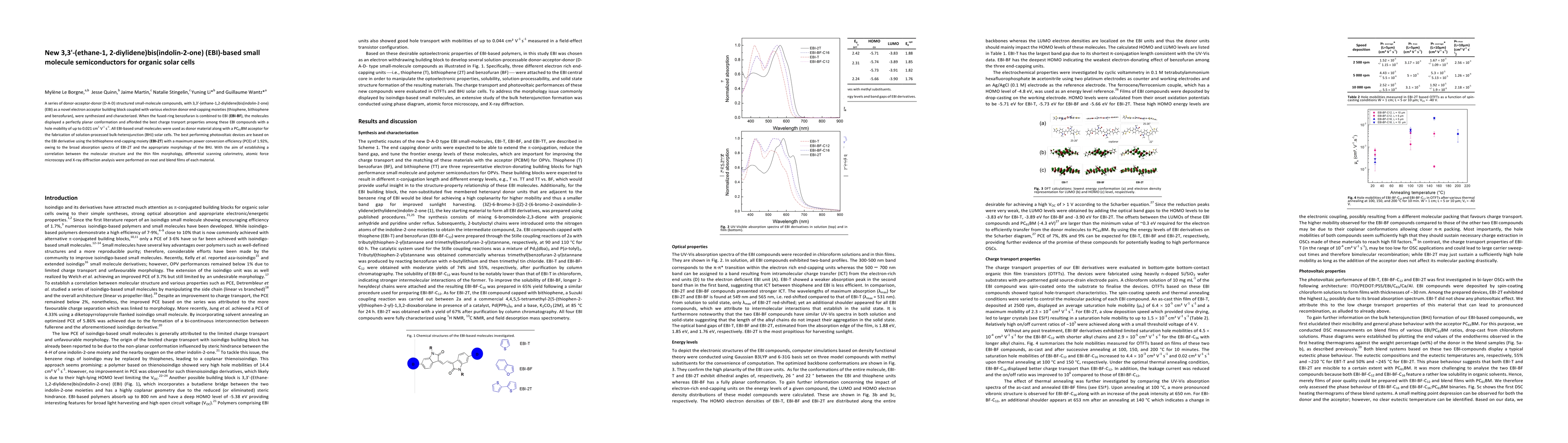 A series of donor-acceptor-donor (D-A-D) structured small-molecule compounds, with 3,3'-(ethane-1,2-diylidene)bis(indolin-2-one) (EBI) as a novel electron acceptor building block coupled with various electron donor end-capping moieties (thiophene, bithiophene and benzofuran), were synthesized and characterized. When the fused-ring benzofuran is combined to EBI (EBI-BF), the molecules displayed a perfectly planar conformation and afforded the best charge tranport properties among these EBI compounds with a hole mobility of up to 0.021 cm2 V-1 s-1. All EBI-based small molecules were used as donor material along with a PC61BM acceptor for the fabrication of solution-processed bulk-heterojunction (BHJ) solar cells. The best performing photovoltaic devices are based on the EBI derivative using the bithiophene end-capping moiety (EBI-2T) with a maximum power conversion efficiency (PCE) of 1.92%, owing to the broad absorption spectra of EBI-2T and the appropriate morphology of the BHJ. With the aim of establishing a correlation between the molecular structure and the thin film morphology, differential scanning calorimetry, atomic force microscopy and X-ray diffraction analysis were performed on neat and blend films of each material.
