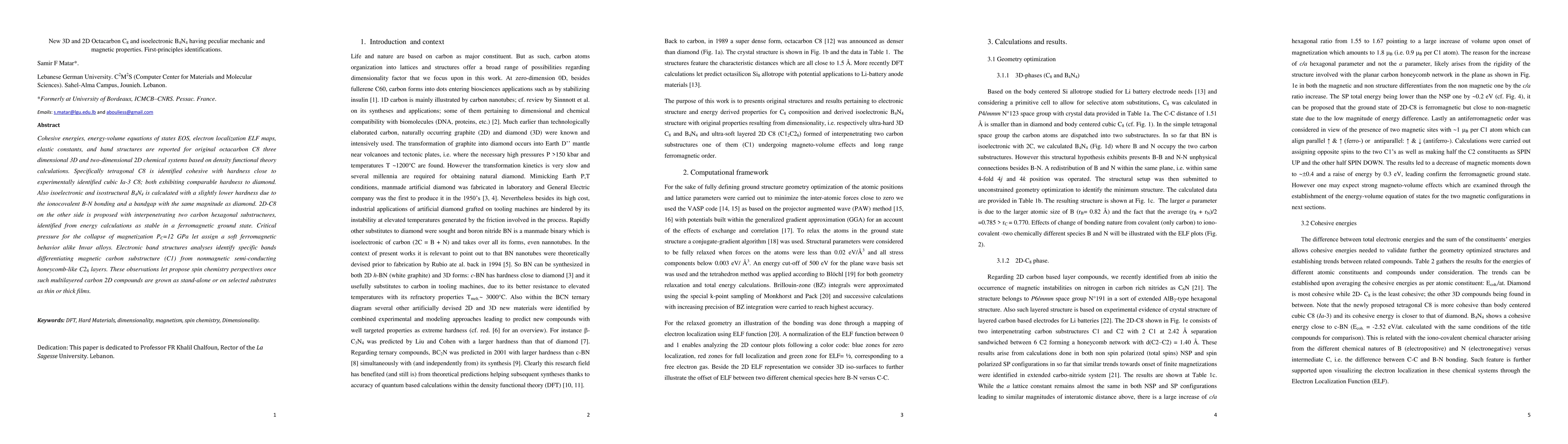 Cohesive energies, energy-volume equations of states EOS, electron localization ELF maps, elastic constants, and band structures are reported for original octacarbon C8 three dimensional 3D and two-dimensional 2D chemical systems based on density functional theory calculations. Specifically, tetragonal C8 is identified cohesive with hardness close to experimentally identified cubic Ia-3 C8; both exhibiting comparable hardness to diamond. Also, isoelectronic and isostructural B4N4 is calculated with a slightly lower hardness due to the ionocovalent B-N bonding and a bandgap with the same magnitude as Diamond. 2D-C8 on the other side is proposed with interpenetrating two carbon hexagonal substructures, identified from energy calculations as stable in a ferromagnetic ground state. Critical pressure for the collapse of magnetization PC=12 GPa let assign a soft ferromagnetic behavior alike Invar alloys. Electronic band structures analyses identify specific bands differentiating magnetic carbon substructure (C1) from nonmagnetic semi-conducting honeycomb-like C26 layers. These observations let propose spin chemistry perspectives once such multilayered carbon 2D compounds are grown as stand-alone or on selected substrates as thin or thick films