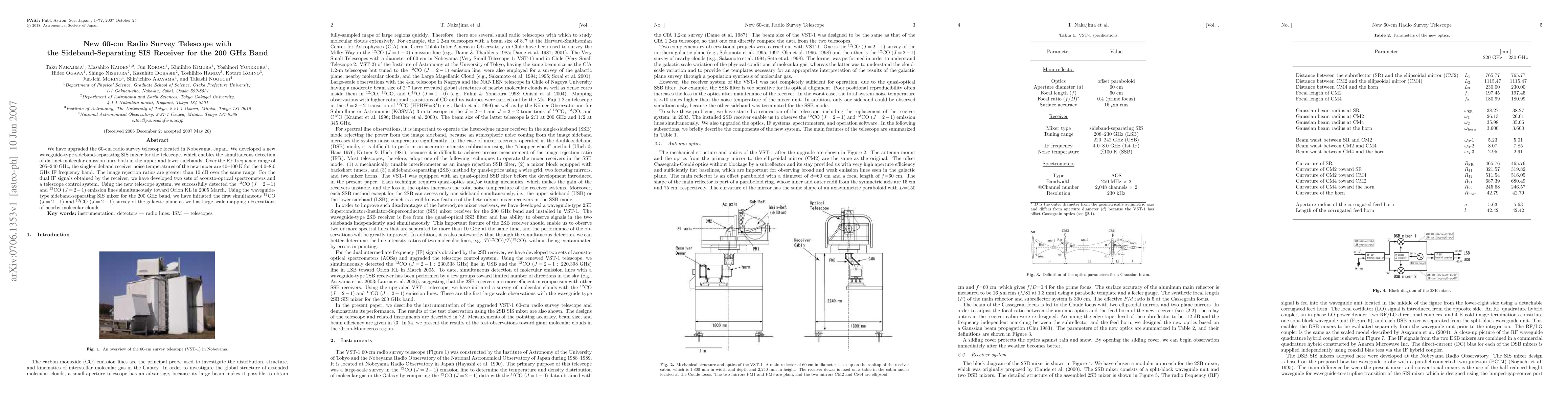 This paper details the upgrade of a 60-cm radio survey telescope in Nobeyama, Japan, featuring a new waveguide-type sideband-separating SIS mixer for the 200 GHz band, enabling simultaneous detection of molecular emission lines. The telescope successfully detected 12CO and 13CO emission lines in Orion KL and initiated surveys of the galactic plane and nearby molecular clouds.