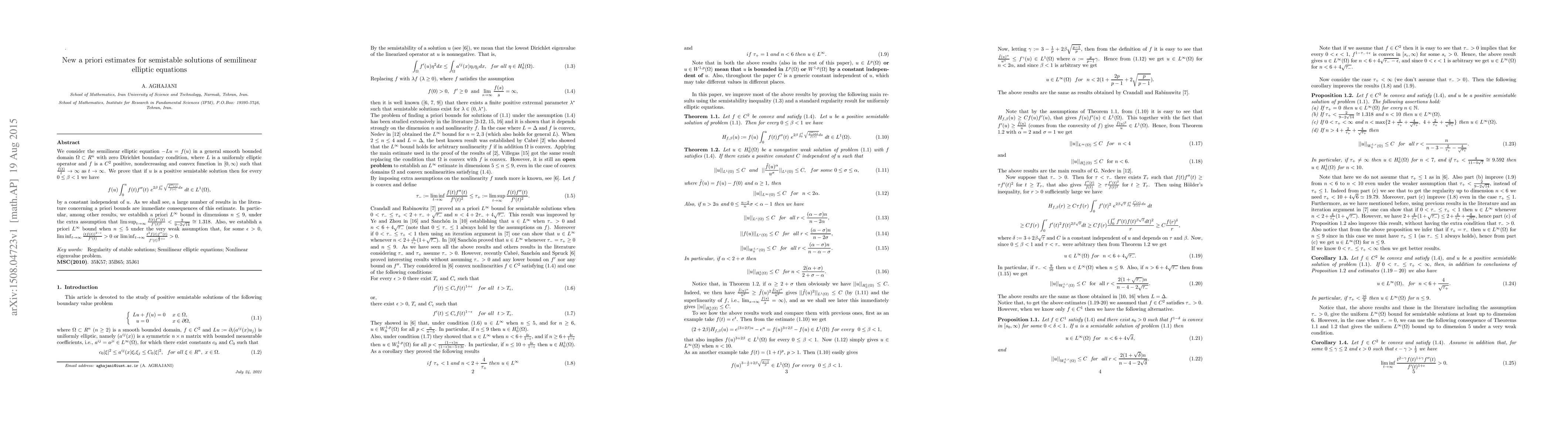 This paper proves new a priori estimates for semistable solutions of semilinear elliptic equations, establishing $L^{\infty}$ bounds under specific conditions on the function $f$. The key result is a $L^1$ estimate for a particular integral involving $f(u)$ and its derivatives, which leads to $L^{\infty}$ bounds in dimensions $n\leq 9$ and $n\leq 5$ under additional assumptions.