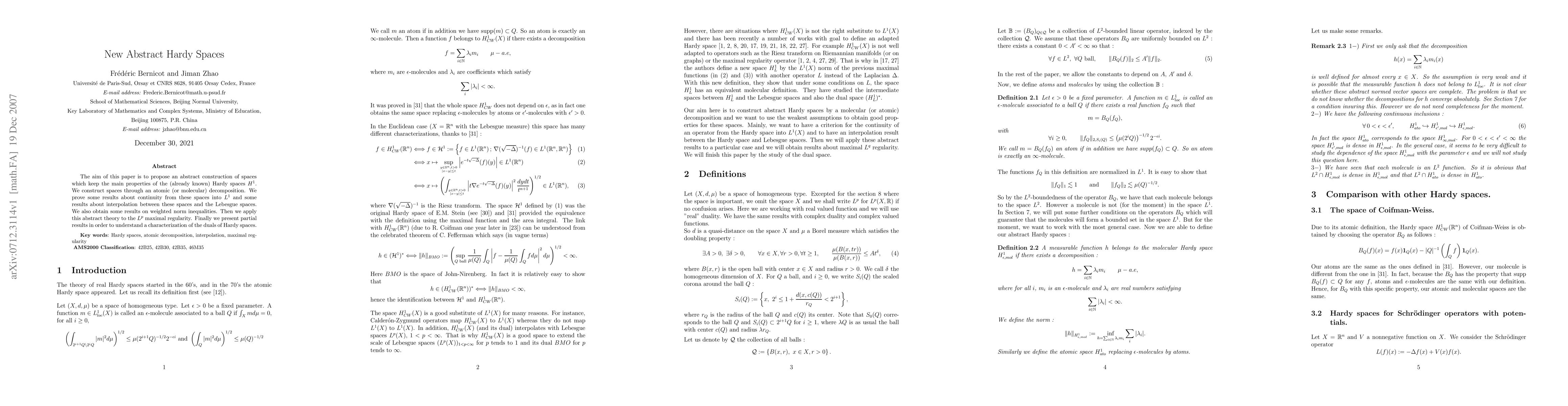 The aim of this paper is to propose an abstract construction of spaces which keep the main properties of the (already known) Hardy spaces H^1. We construct spaces through an atomic (or molecular) decomposition. We prove some results about continuity from these spaces into L^1 and some results about interpolation between these spaces and the Lebesgue spaces. We also obtain some results on weighted norm inequalities. Then we apply this abstract theory to the L^p maximal regularity. Finally we present partial results in order to understand a characterization of the duals of Hardy spaces.