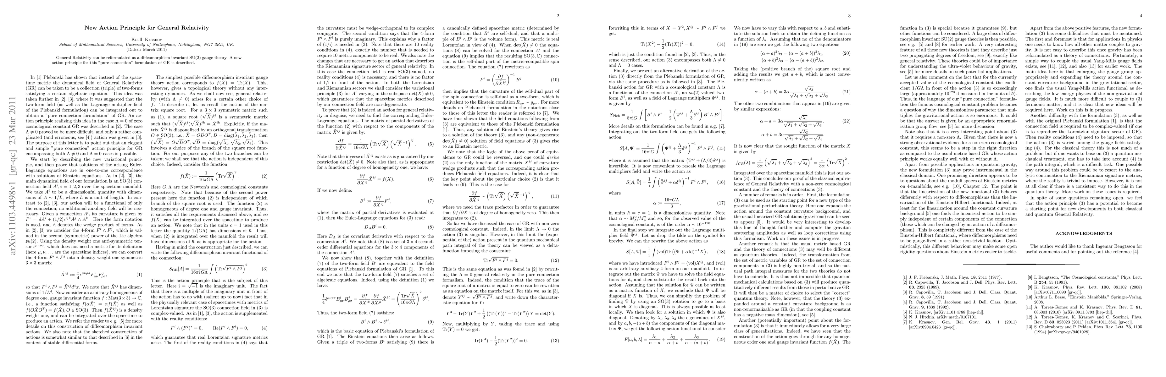 Summary: This paper reformulates General Relativity as a diffeomorphism invariant SU(2) gauge theory and introduces a new action principle for its "pure connection" formulation, offering a novel perspective on gravitational dynamics.