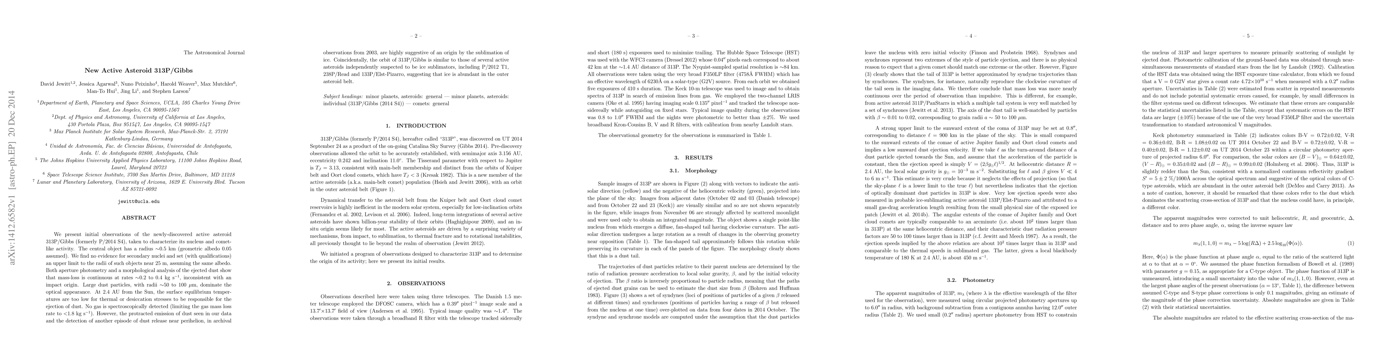 We present initial observations of the newly-discovered active asteroid 313P/Gibbs (formerly P/2014 S4), taken to characterize its nucleus and comet-like activity. The central object has a radius $\sim$0.5 km (geometric albedo 0.05 assumed). We find no evidence for secondary nuclei and set (with qualifications) an upper limit to the radii of such objects near 25 m, assuming the same albedo. Both aperture photometry and a morphological analysis of the ejected dust show that mass-loss is continuous at rates $\sim$0.2 to 0.4 kg s$^{-1}$, inconsistent with an impact origin. Large dust particles, with radii $\sim$50 to 100 $\mu$m, dominate the optical appearance. At 2.4 AU from the Sun, the surface equilibrium temperatures are too low for thermal or desiccation stresses to be responsible for the ejection of dust. No gas is spectroscopically detected (limiting the gas mass loss rate to $<$1.8 kg s$^{-1}$). However, the protracted emission of dust seen in our data and the detection of another episode of dust release near perihelion, in archival observations from 2003, are highly suggestive of an origin by the sublimation of ice. Coincidentally, the orbit of 313P/Gibbs is similar to those of several active asteroids independently suspected to be ice sublimators, including P/2012 T1, 238P/Read and 133P/Elst-Pizarro, suggesting that ice is abundant in the outer asteroid belt.