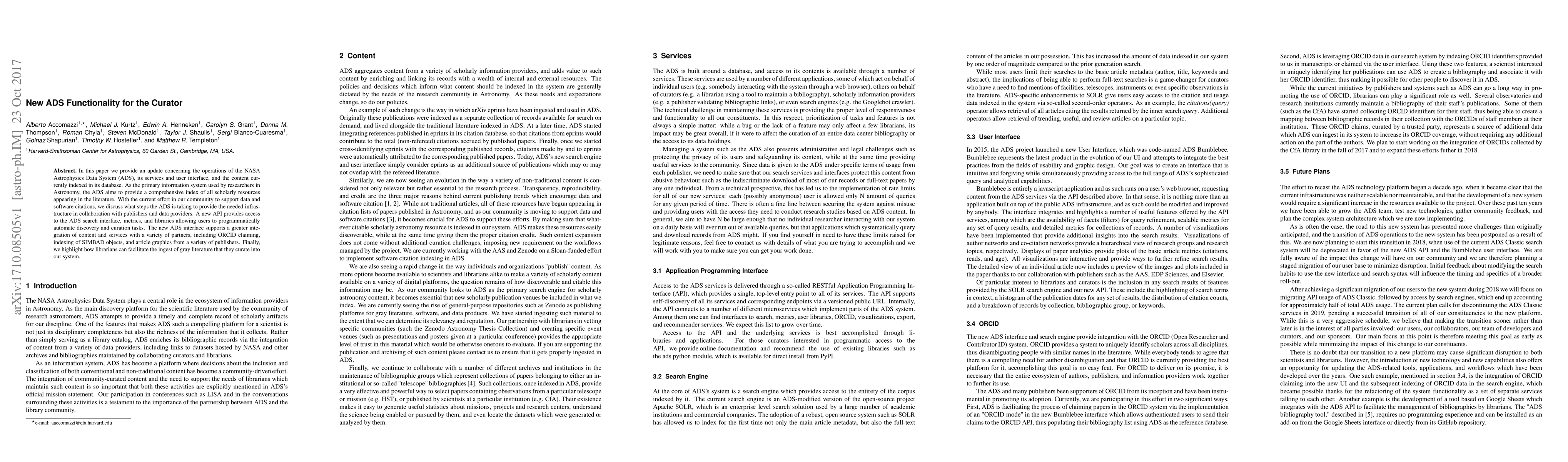 In this paper we provide an update concerning the operations of the NASA Astrophysics Data System (ADS), its services and user interface, and the content currently indexed in its database. As the primary information system used by researchers in Astronomy, the ADS aims to provide a comprehensive index of all scholarly resources appearing in the literature. With the current effort in our community to support data and software citations, we discuss what steps the ADS is taking to provide the needed infrastructure in collaboration with publishers and data providers. A new API provides access to the ADS search interface, metrics, and libraries allowing users to programmatically automate discovery and curation tasks. The new ADS interface supports a greater integration of content and services with a variety of partners, including ORCID claiming, indexing of SIMBAD objects, and article graphics from a variety of publishers. Finally, we highlight how librarians can facilitate the ingest of gray literature that they curate into our system.