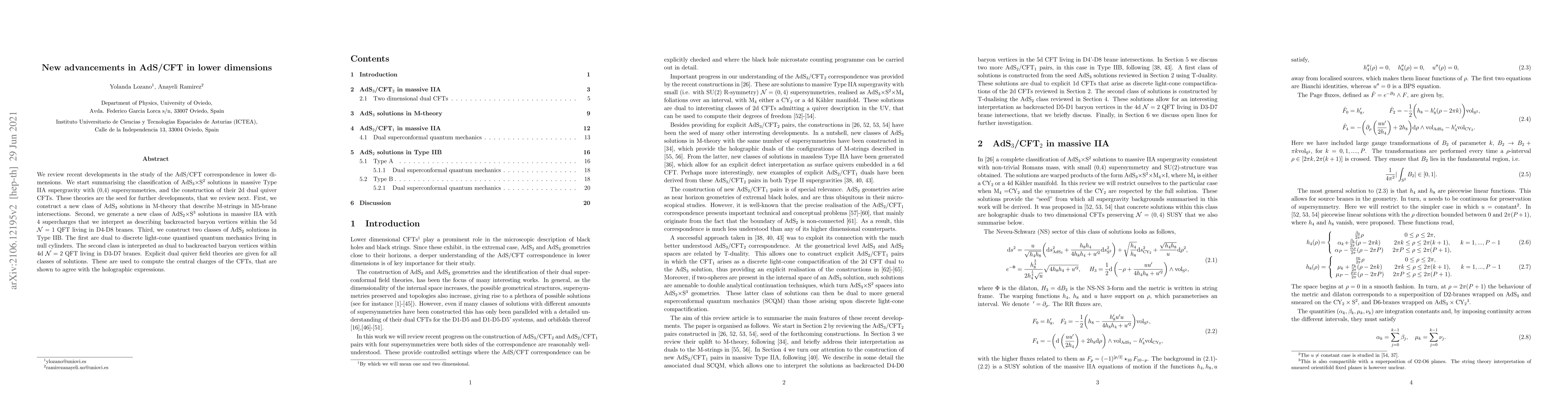 We review recent developments in the study of the AdS/CFT correspondence in lower dimensions. We start summarising the classification of AdS$_3\times$S$^2$ solutions in massive Type IIA supergravity with (0,4) supersymmetries, and the construction of their 2d dual quiver CFTs. These theories are the seed for further developments, that we review next. First, we construct a new class of AdS$_3$ solutions in M-theory that describe M-strings in M5-brane intersections. Second, we generate a new class of AdS$_2\times$S$^3$ solutions in massive IIA with 4 supercharges that we interpret as describing backreacted baryon vertices within the 5d $\mathcal{N}=1$ QFT living in D4-D8 branes. Third, we construct two classes of AdS$_2$ solutions in Type IIB. The first are dual to discrete light-cone quantised quantum mechanics living in null cylinders. The second class is interpreted as dual to backreacted baryon vertices within 4d $\mathcal{N}=2$ QFT living in D3-D7 branes. Explicit dual quiver field theories are given for all classes of solutions. These are used to compute the central charges of the CFTs, that are shown to agree with the holographic expressions.