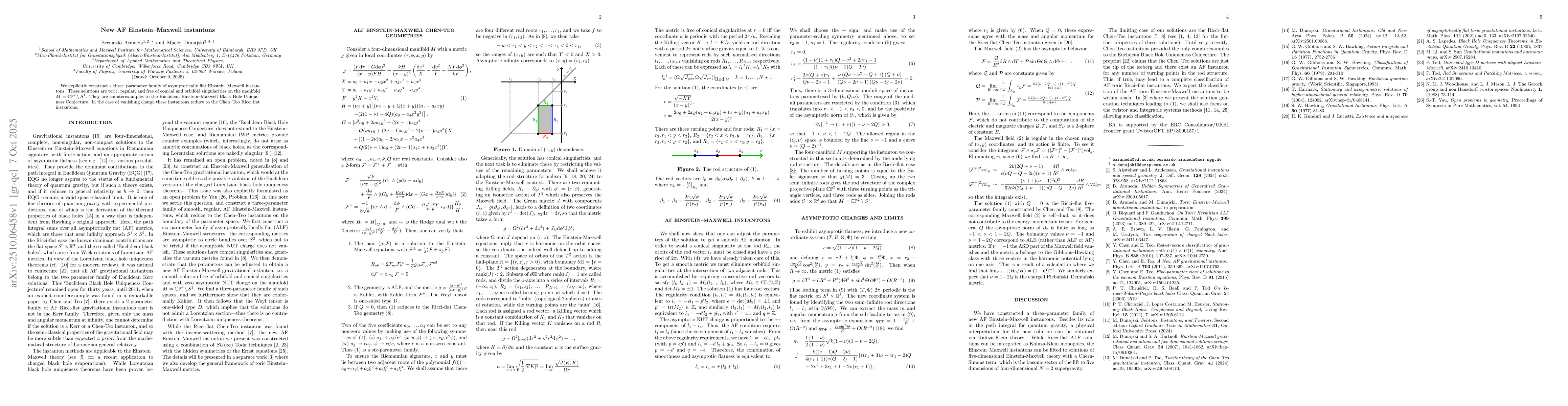 The authors constructed a three-parameter family of asymptotically flat Einstein--Maxwell instantons using a toric geometry approach with rod structure formalism and symmetry reductions.