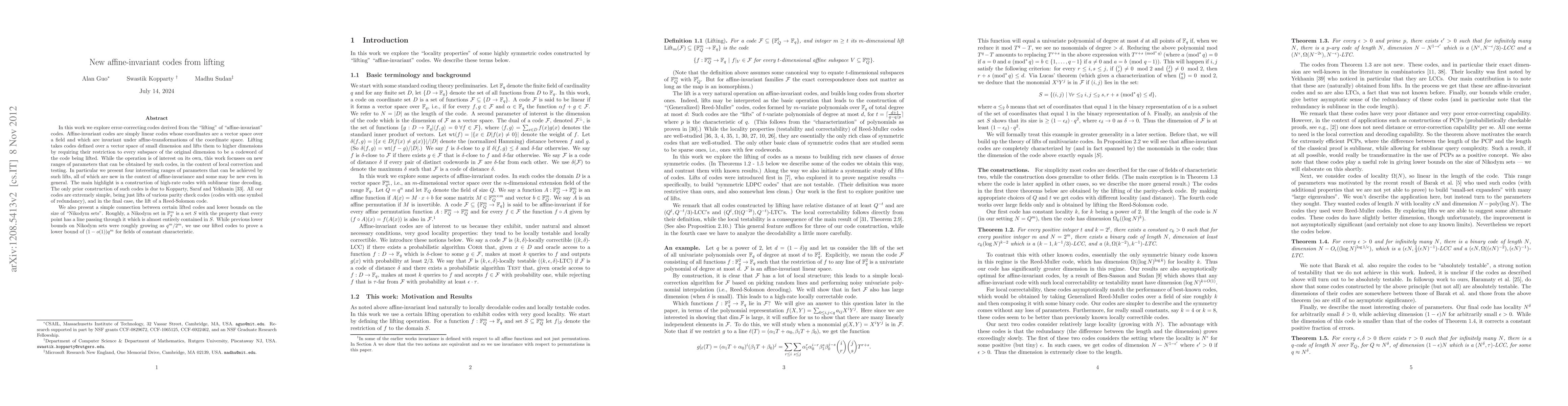This paper introduces new affine-invariant error-correcting codes derived from the "lifting" technique, achieving new parameter ranges for local correction and testing. The main achievement is high-rate codes with sublinear time decoding, surpassing previous constructions. Additionally, it establishes a connection between lifted codes and improved lower bounds on the size of Nikodym sets.