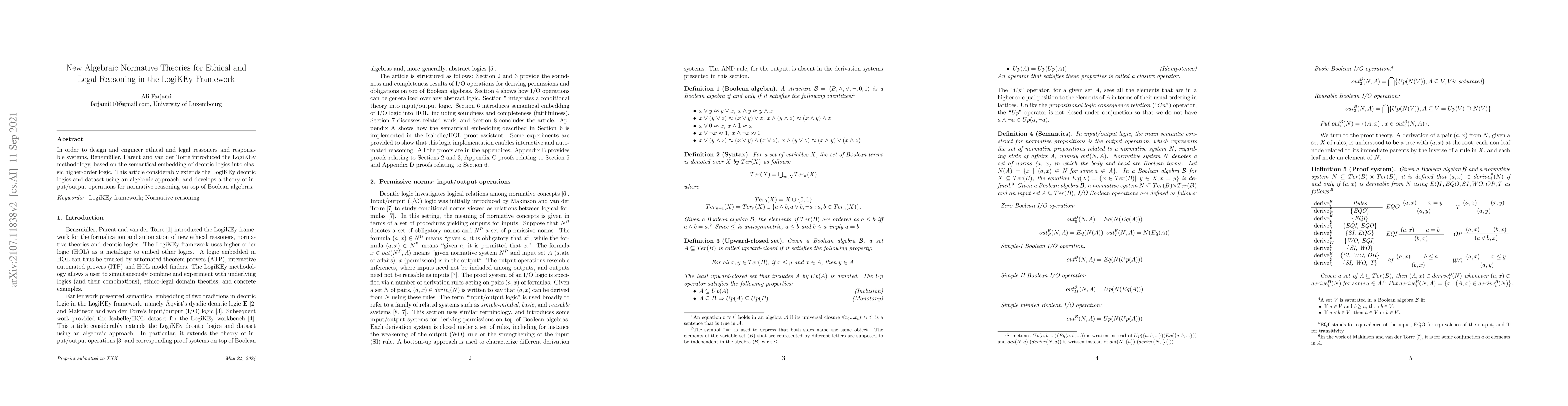 In order to design and engineer ethical and legal reasoners and responsible systems, Benzm\"{u}ller, Parent and van der Torre introduced the LogiKEy methodology, based on the semantical embedding of deontic logics into classic higher-order logic. This article considerably extends the LogiKEy deontic logics and dataset using an algebraic approach, and develops a theory of input/output operations for normative reasoning on top of Boolean algebras.