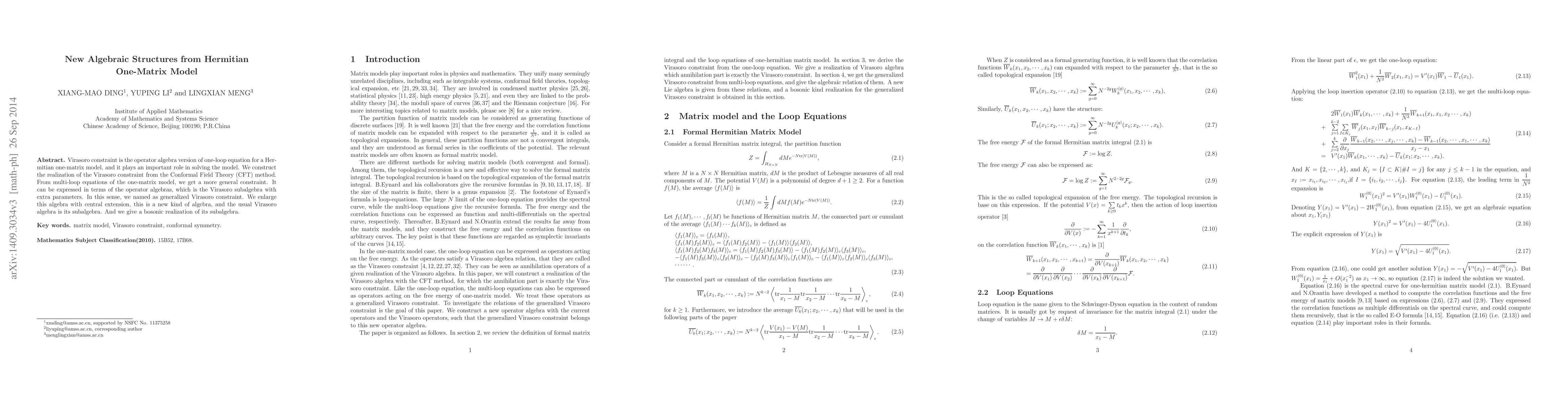 Virasoro constraint is the operator algebra version of one-loop equation for a Hermitian one-matrix model, and it plays an important role in solving the model. We construct the realization of the Virasoro constraint from the Conformal Field Theory (CFT) method. From multi-loop equations of the one-matrix model, we get a more general constraint. It can be expressed in terms of the operator algebras, which is the Virasoro subalgebra with extra parameters. In this sense, we named as generalized Virasoro constraint. We enlarge this algebra with central extension, this is a new kind of algebra, and the usual Virasoro algebra is its subalgebra. And we give a bosonic realization of its subalgebra.