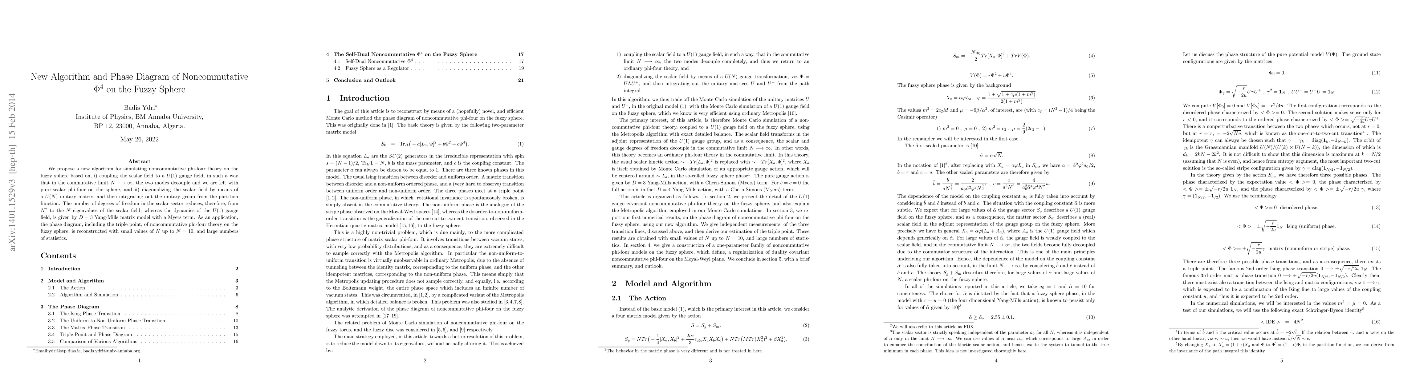 The paper introduces a novel algorithm for simulating noncommutative phi-four theory on a fuzzy sphere by coupling a scalar field to a U(1) gauge field and integrating out the U(N) unitary group. The resulting phase diagram includes a triple point, derived with simulations up to N=10.