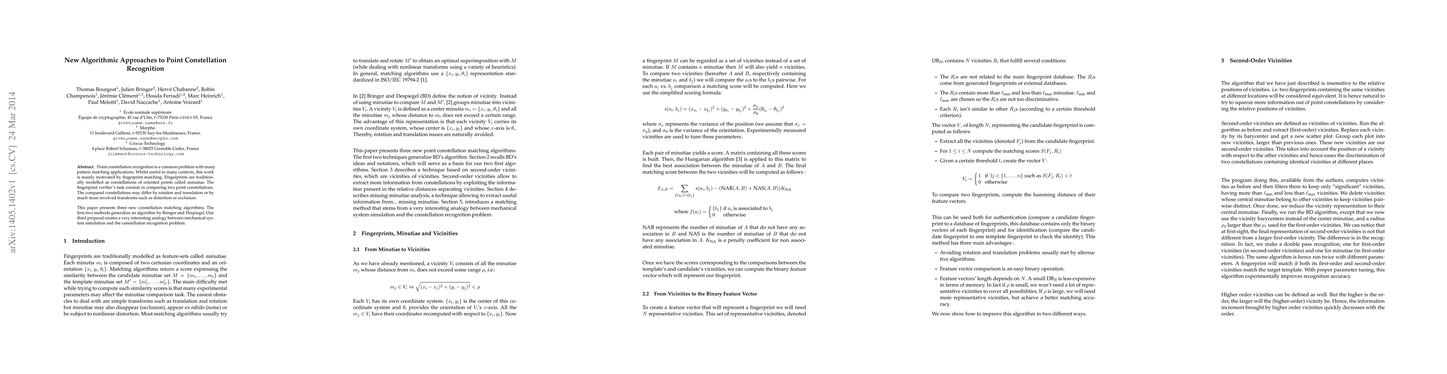 Point constellation recognition is a common problem with many pattern matching applications. Whilst useful in many contexts, this work is mainly motivated by fingerprint matching. Fingerprints are traditionally modelled as constellations of oriented points called minutiae. The fingerprint verifier's task consists in comparing two point constellations. The compared constellations may differ by rotation and translation or by much more involved transforms such as distortion or occlusion. This paper presents three new constellation matching algorithms. The first two methods generalize an algorithm by Bringer and Despiegel. Our third proposal creates a very interesting analogy between mechanical system simulation and the constellation recognition problem.