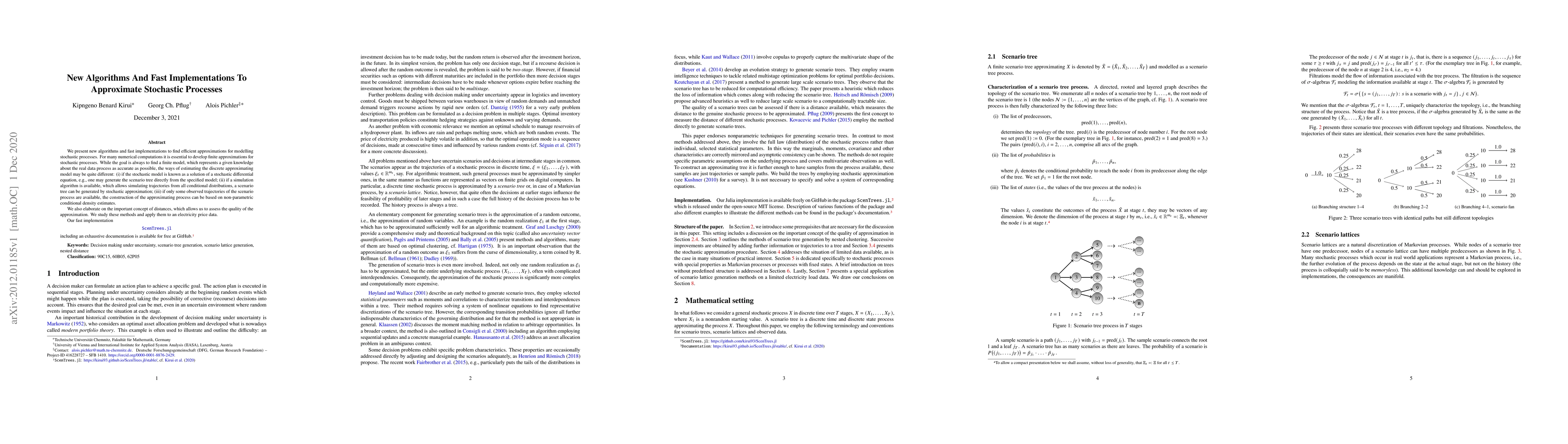 We present new algorithms and fast implementations to find efficient approximations for modelling stochastic processes. For many numerical computations it is essential to develop finite approximations for stochastic processes. While the goal is always to find a finite model, which represents a given knowledge about the real data process as accurate as possible, the ways of estimating the discrete approximating model may be quite different: (i) if the stochastic model is known as a solution of a stochastic differential equation, e.g., one may generate the scenario tree directly from the specified model; (ii) if a simulation algorithm is available, which allows simulating trajectories from all conditional distributions, a scenario tree can be generated by stochastic approximation; (iii) if only some observed trajectories of the scenario process are available, the construction of the approximating process can be based on non-parametric conditional density estimates.