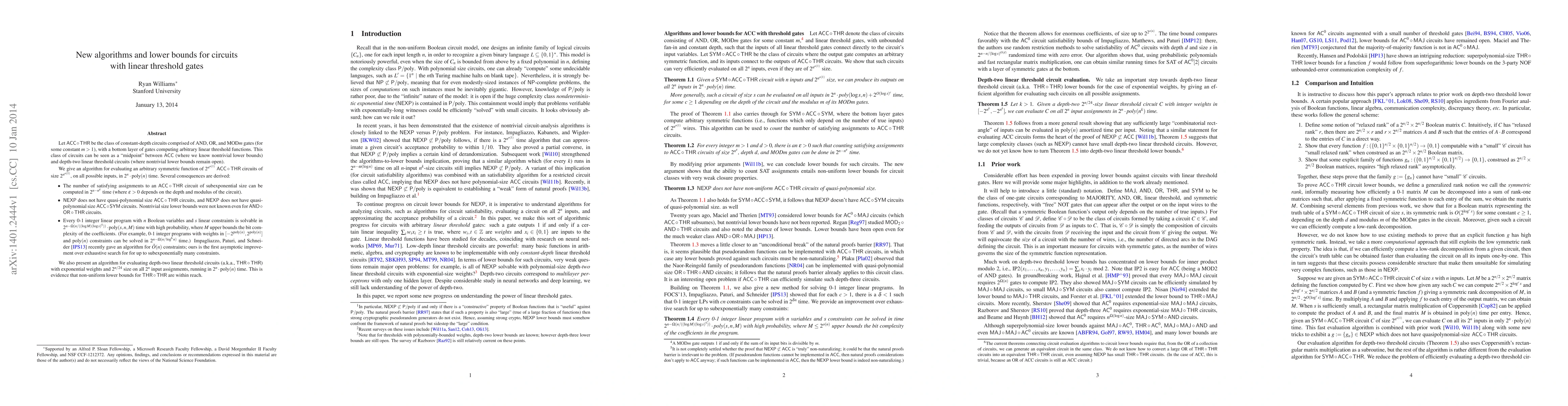 Let $ACC \circ THR$ be the class of constant-depth circuits comprised of AND, OR, and MOD$m$ gates (for some constant $m > 1$), with a bottom layer of gates computing arbitrary linear threshold functions. This class of circuits can be seen as a "midpoint" between $ACC$ (where we know nontrivial lower bounds) and depth-two linear threshold circuits (where nontrivial lower bounds remain open). We give an algorithm for evaluating an arbitrary symmetric function of $2^{n^{o(1)}}$ $ACC \circ THR$ circuits of size $2^{n^{o(1)}}$, on all possible inputs, in $2^n \cdot poly(n)$ time. Several consequences are derived: $\bullet$ The number of satisfying assignments to an $ACC \circ THR$ circuit of subexponential size can be computed in $2^{n-n^{\varepsilon}}$ time (where $\varepsilon > 0$ depends on the depth and modulus of the circuit). $\bullet$ $NEXP$ does not have quasi-polynomial size $ACC \circ THR$ circuits, nor does $NEXP$ have quasi-polynomial size $ACC \circ SYM$ circuits. Nontrivial size lower bounds were not known even for $AND \circ OR \circ THR$ circuits. $\bullet$ Every 0-1 integer linear program with $n$ Boolean variables and $s$ linear constraints is solvable in $2^{n-\Omega(n/((\log M)(\log s)^{5}))}\cdot poly(s,n,M)$ time with high probability, where $M$ upper bounds the bit complexity of the coefficients. (For example, 0-1 integer programs with weights in $[-2^{poly(n)},2^{poly(n)}]$ and $poly(n)$ constraints can be solved in $2^{n-\Omega(n/\log^6 n)}$ time.) We also present an algorithm for evaluating depth-two linear threshold circuits (a.k.a., $THR \circ THR$) with exponential weights and $2^{n/24}$ size on all $2^n$ input assignments, running in $2^n \cdot poly(n)$ time. This is evidence that non-uniform lower bounds for $THR \circ THR$ are within reach.