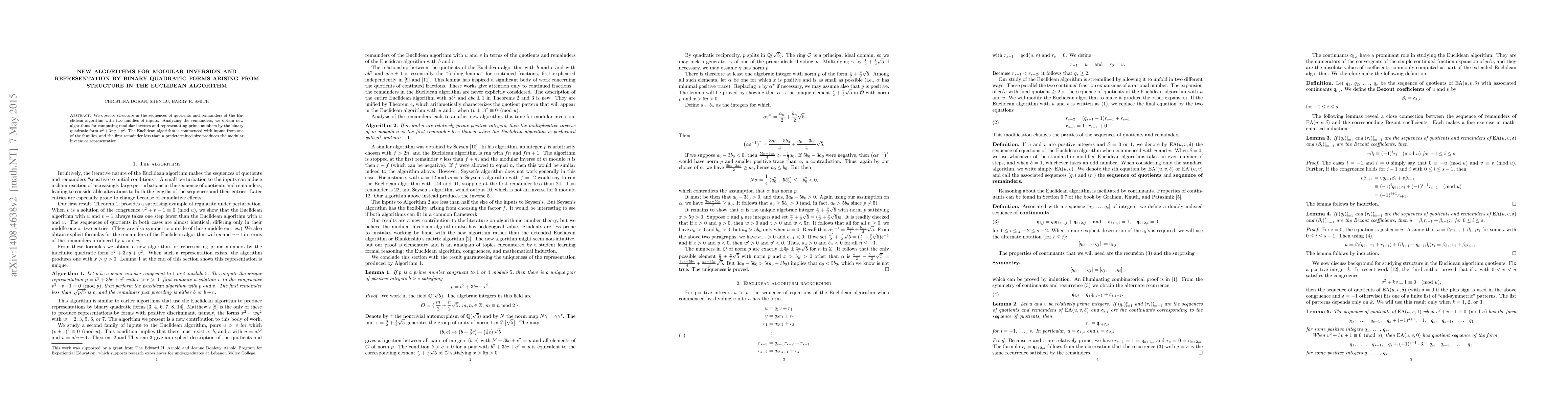 We observe structure in the sequences of quotients and remainders of the Euclidean algorithm with two families of inputs. Analyzing the remainders, we obtain new algorithms for computing modular inverses and representating prime numbers by the binary quadratic form $x^2 + 3xy + y^2$. The Euclidean algorithm is commenced with inputs from one of the families, and the first remainder less than a predetermined size produces the modular inverse or representation.