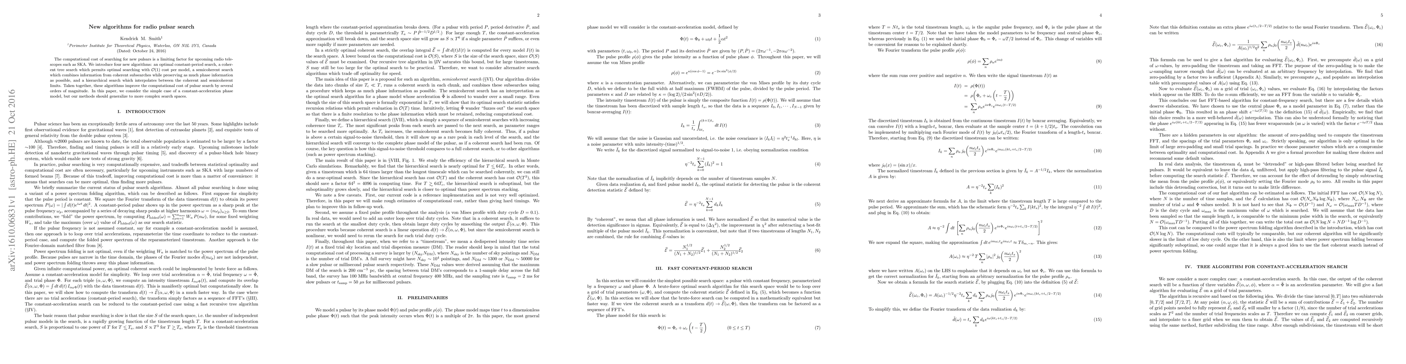 The computational cost of searching for new pulsars is a limiting factor for upcoming radio telescopes such as SKA. We introduce four new algorithms: an optimal constant-period search, a coherent tree search which permits optimal searching with O(1) cost per model, a semicoherent search which combines information from coherent subsearches while preserving as much phase information as possible, and a hierarchical search which interpolates between the coherent and semicoherent limits. Taken together, these algorithms improve the computational cost of pulsar search by several orders of magnitude. In this paper, we consider the simple case of a constant-acceleration phase model, but our methods should generalize to more complex search spaces.