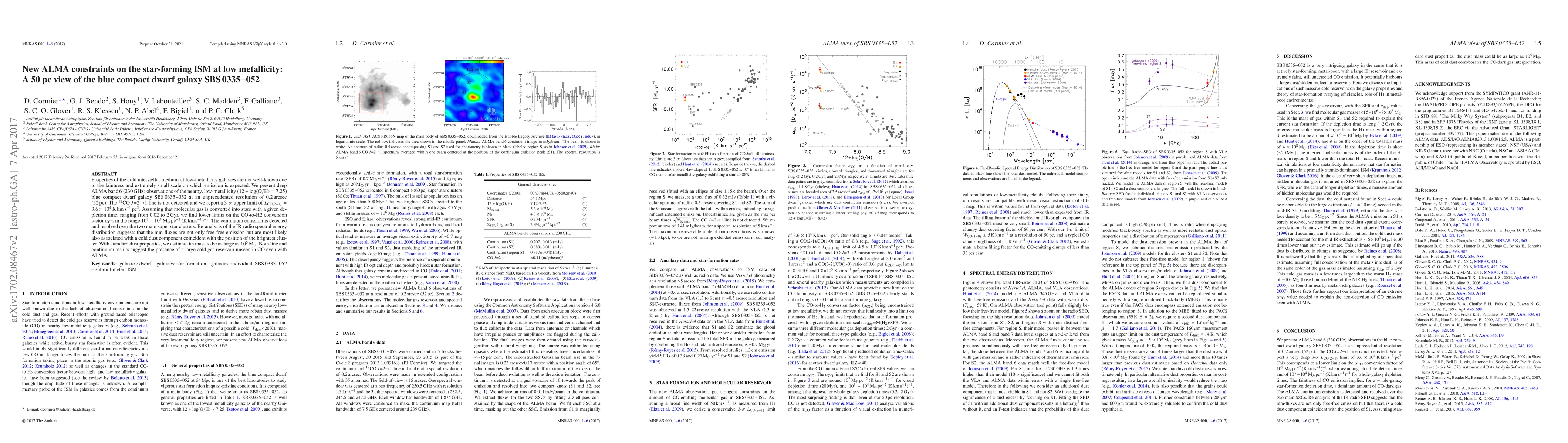 This study uses ALMA observations to investigate the cold interstellar medium in the low-metallicity blue compact dwarf galaxy SBS0335-052, finding no detection of the 12CO J=2-1 line and suggesting a large cold gas reservoir not traced by CO. The detected dust mass is estimated to be around 10^5 Msun.