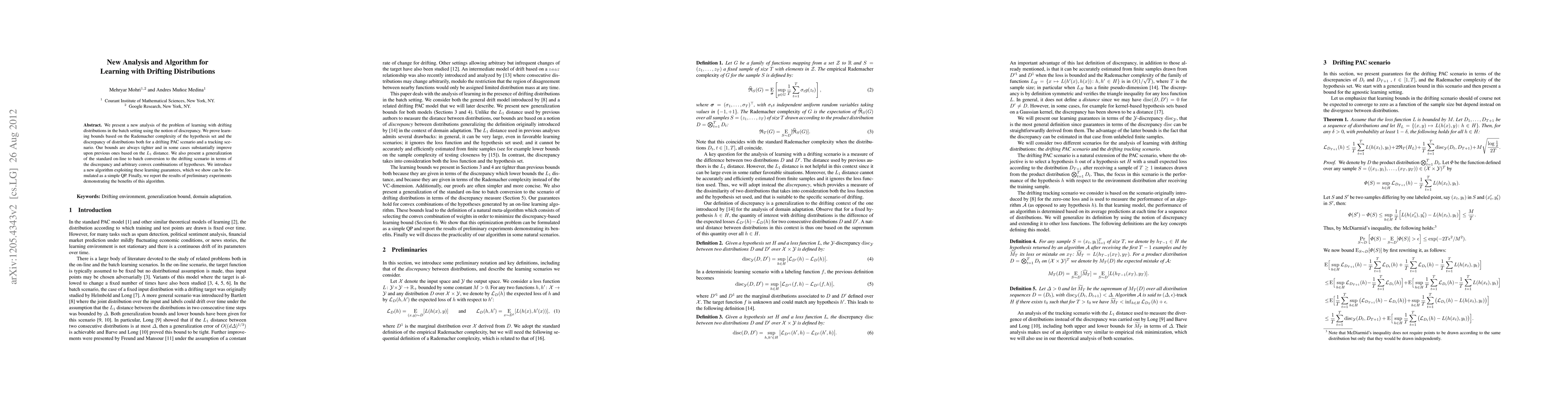 This research introduces a novel analysis of learning with drifting distributions, using discrepancy notion. It presents tighter learning bounds than previous $L_1$ distance-based bounds, proposes a generalized on-line to batch conversion, and develops a QP-formulated algorithm demonstrating improved performance in preliminary experiments.
