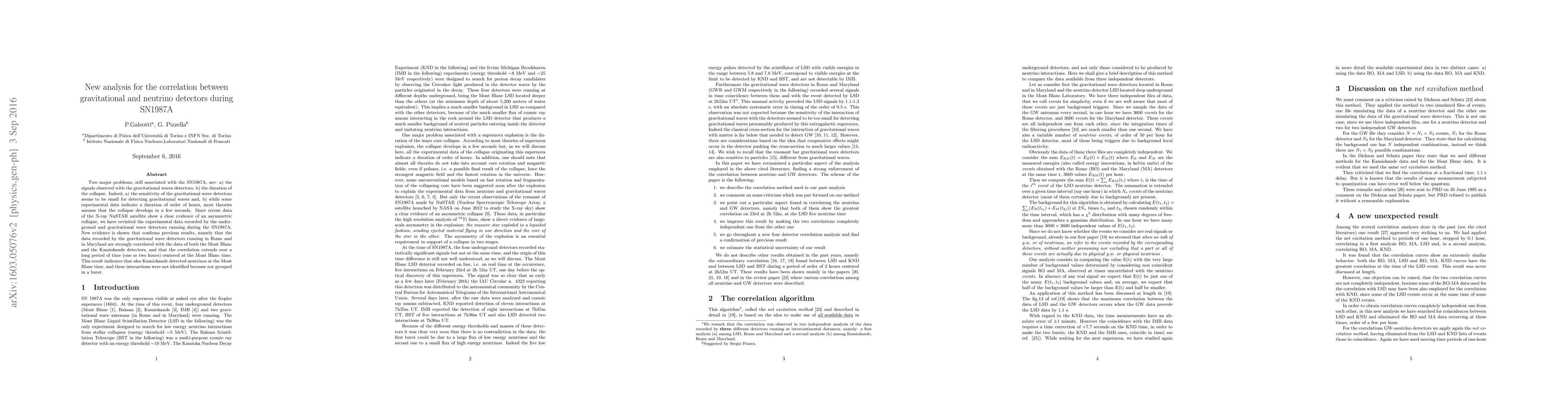 Two major problems, still associated with the SN1987A, are: a) the signals observed with the gravitational waves detectors, b) the duration of the collapse. Indeed, a) the sensitivity of the gravitational wave detectors seems to be small for detecting gravitational waves and, b) while some experimental data indicate a duration of order of hours, most theories assume that the collapse develops in a few seconds. Since recent data of the X-ray NuSTAR satellite show a clear evidence of an asymmetric collapse, we have revisited the experimental data recorded by the underground and gravitational wave detectors running during the SN1987A. New evidence is shown that con rms previous results, namely that the data recorded by the gravitational wave detectors running in Rome and in Maryland are strongly correlated with the data of both the Mont Blanc and the Kamiokande detectors, and that the correlation extends over a long period of time (one or two hours) centered at the Mont Blanc time. This result indicates that also Kamiokande detected neutrinos at the Mont Blanc time, and these interactions were not identi ed because not grouped in a burst.