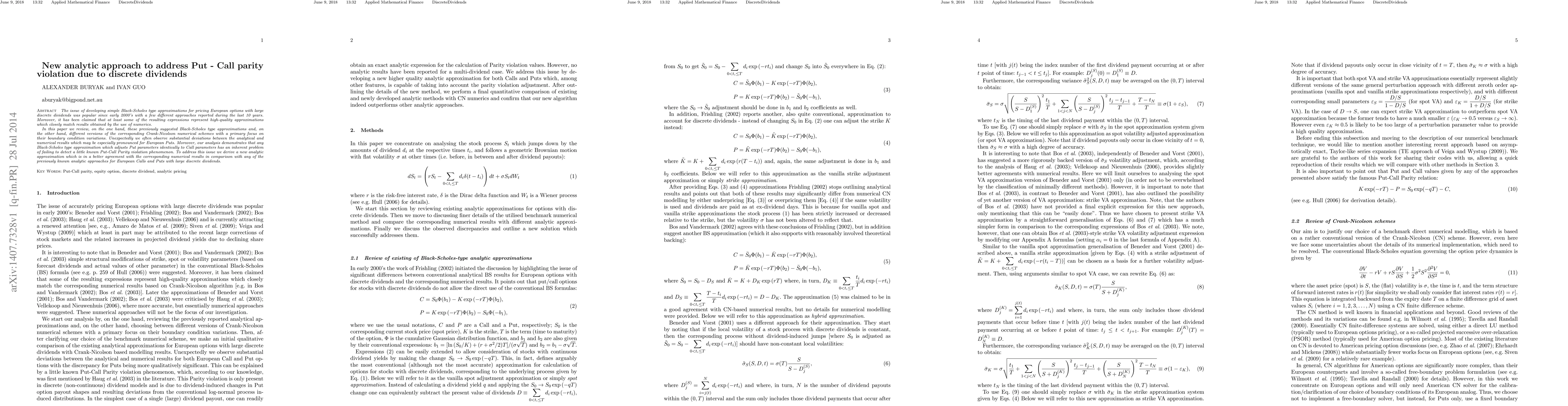The issue of developing simple Black-Scholes type approximations for pricing European options with large discrete dividends was popular since early 2000's with a few different approaches reported during the last 10 years. Moreover, it has been claimed that at least some of the resulting expressions represent high-quality approximations which closely match results obtained by the use of numerics. In this paper we review, on the one hand, these previously suggested Black-Scholes type approximations and, on the other hand, different versions of the corresponding Crank-Nicolson numerical schemes with a primary focus on their boundary condition variations. Unexpectedly we often observe substantial deviations between the analytical and numerical results which may be especially pronounced for European Puts. Moreover, our analysis demonstrates that any Black-Scholes type approximation which adjusts Put parameters identically to Call parameters has an inherent problem of failing to detect a little known Put-Call Parity violation phenomenon. To address this issue we derive a new analytic approximation which is in a better agreement with the corresponding numerical results in comparison with any of the previously known analytic approaches for European Calls and Puts with large discrete dividends.