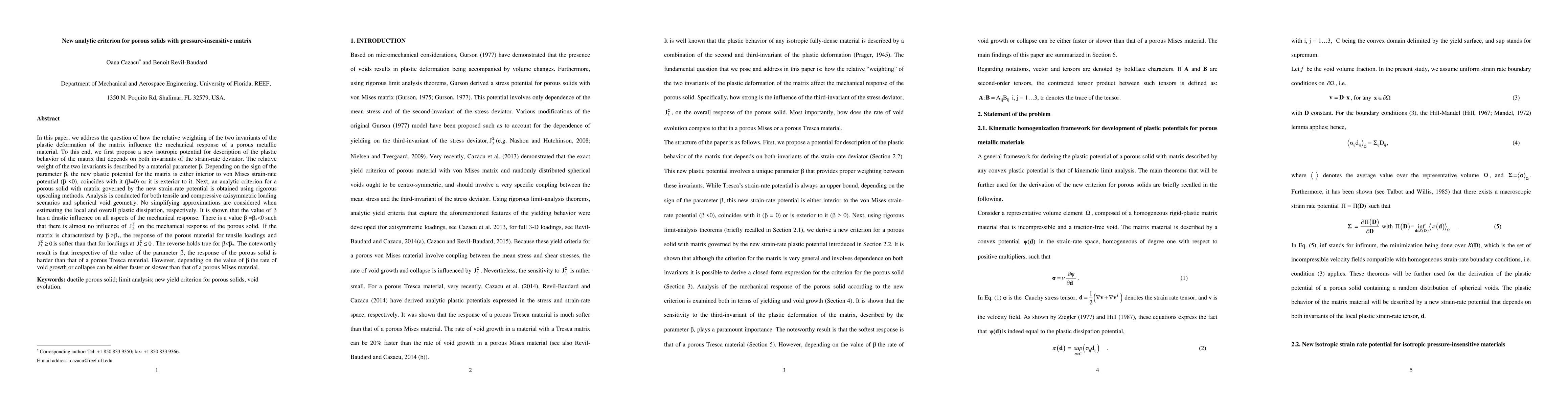 This paper proposes a new isotropic potential for describing the plastic behavior of a pressure-insensitive matrix in porous metallic materials, influenced by two strain-rate invariants. It introduces a material parameter b that determines the plastic potential's relative weighting, leading to an analytic criterion for the porous solid's mechanical response under various loading conditions. The study finds that the parameter b drastically affects the material's response, with the porous solid's behavior always harder than a porous Tresca material.