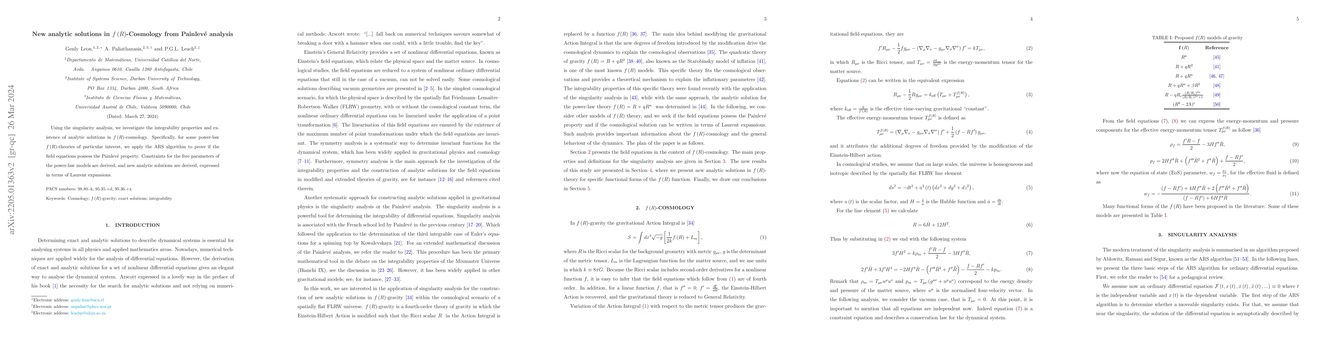 This research explores the integrability and analytic solutions of $f(R)$-cosmology through singularity analysis and Painlevé property examination. New analytic solutions are derived using the ARS algorithm, expressed as Laurent expansions, and constraints on the free parameters of specific power-law $f(R)$-theories are established.