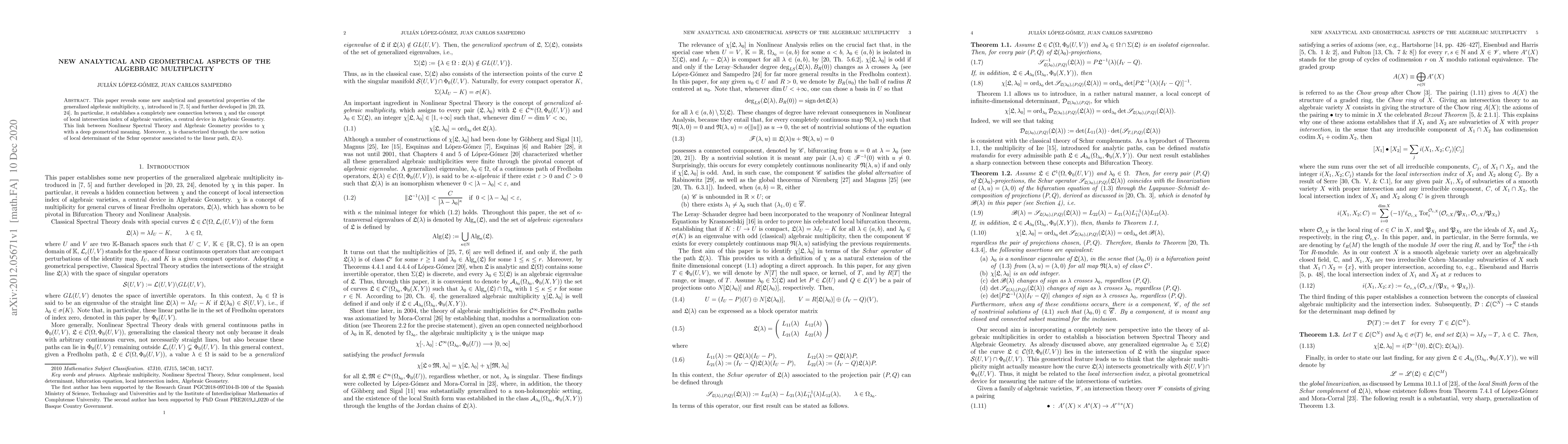 This paper reveals some new analytical and geometrical properties of the generalized algebraic multiplicity, $\chi$, introduced in [7, 5] and further developed in [20, 23, 24]. In particular, it establishes a completely new connection between $\chi$ and the concept of local intersection index of algebraic varieties, a central device in Algebraic Geometry. This link between Nonlinear Spectral Theory and Algebraic Geometry provides to $\chi$ with a deep geometrical meaning. Moreover, $\chi$ is characterized through the new notion of local determinant of the Schur operator associated to the linear path, $\mathfrak{L}(\lambda)$.