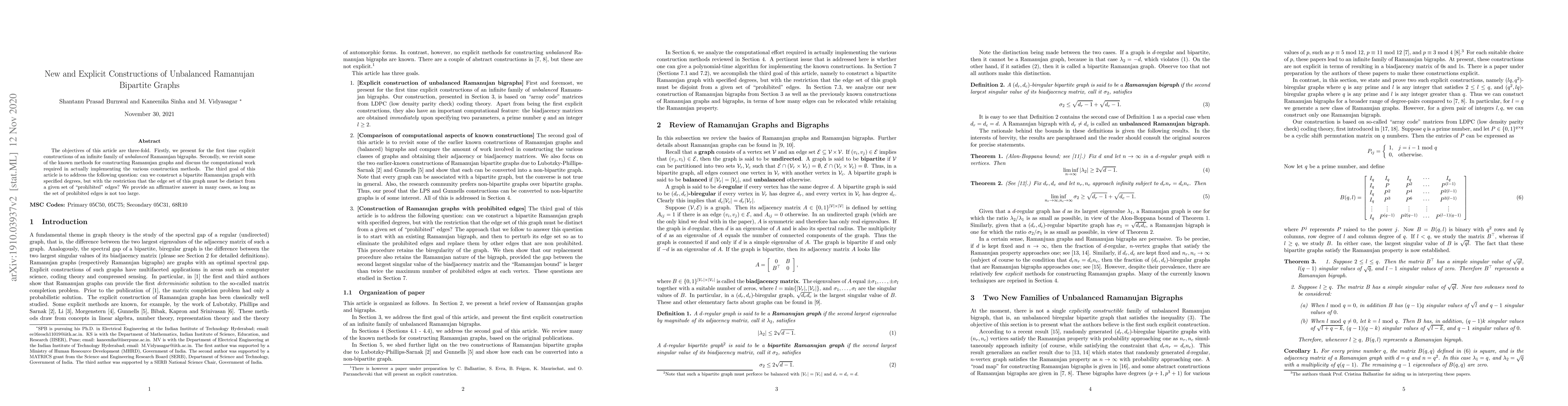 The objectives of this article are three-fold. Firstly, we present for the first time explicit constructions of an infinite family of \textit{unbalanced} Ramanujan bigraphs. Secondly, we revisit some of the known methods for constructing Ramanujan graphs and discuss the computational work required in actually implementing the various construction methods. The third goal of this article is to address the following question: can we construct a bipartite Ramanujan graph with specified degrees, but with the restriction that the edge set of this graph must be distinct from a given set of "prohibited" edges? We provide an affirmative answer in many cases, as long as the set of prohibited edges is not too large.