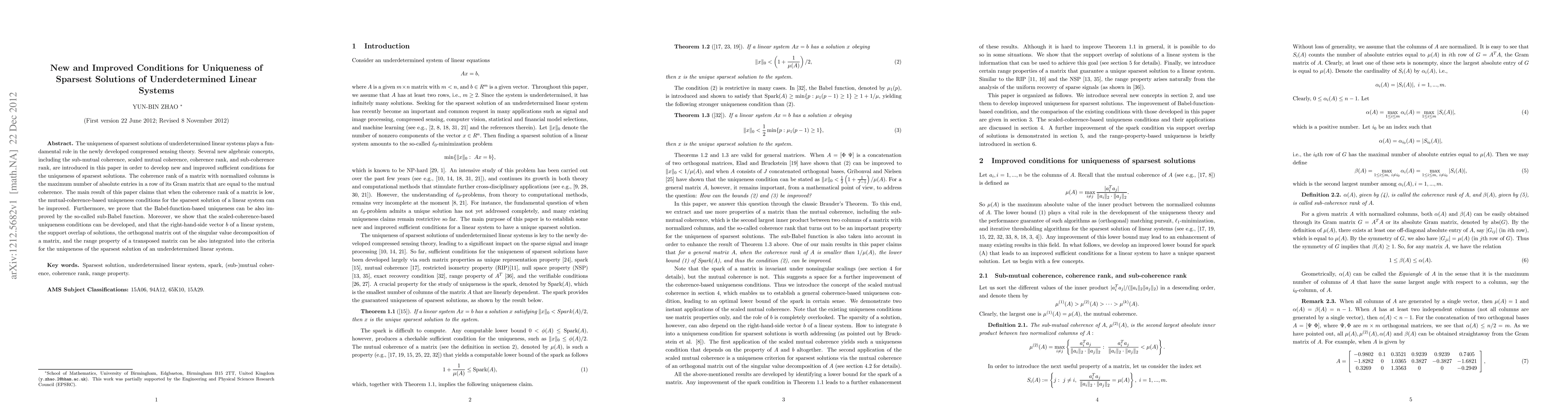 Researchers developed new conditions to ensure uniqueness of sparsest solutions in underdetermined linear systems, improving upon existing methods by considering matrix coherence ranks and sub-coherence.