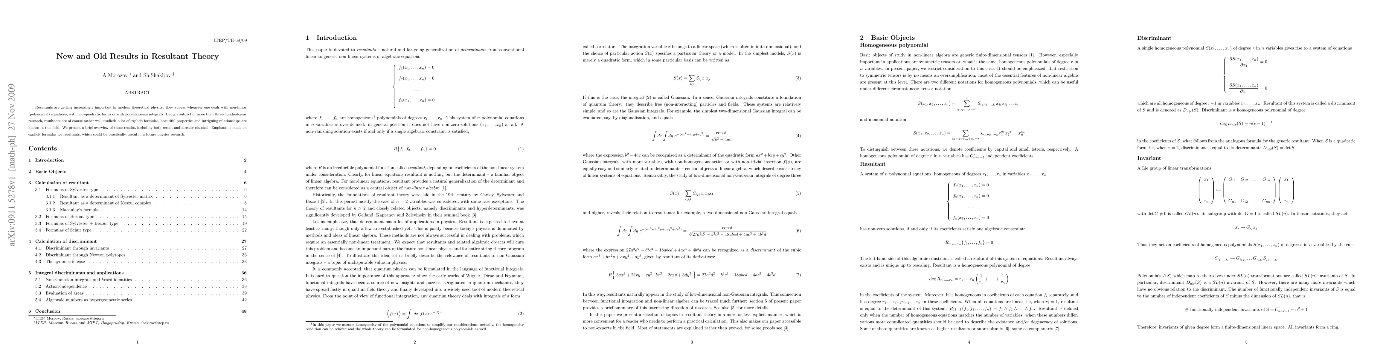 Resultants are getting increasingly important in modern theoretical physics: they appear whenever one deals with non-linear (polynomial) equations, with non-quadratic forms or with non-Gaussian integrals. Being a subject of more than three-hundred-year research, resultants are of course rather well studied: a lot of explicit formulas, beautiful properties and intriguing relationships are known in this field. We present a brief overview of these results, including both recent and already classical. Emphasis is made on explicit formulas for resultants, which could be practically useful in a future physics research.