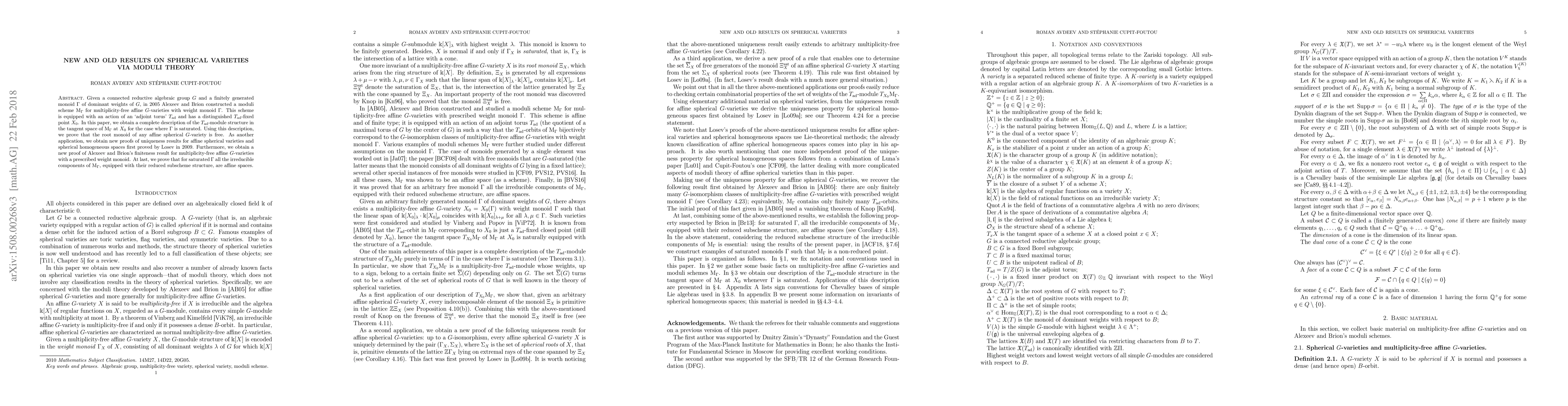 This paper provides a complete description of the $T_{\mathrm{ad}}$-module structure in the tangent space of a moduli scheme for multiplicity-free affine $G$-varieties, proving that the root monoid of any affine spherical $G$-variety is free. It also offers new proofs for uniqueness results and finiteness results for such varieties.