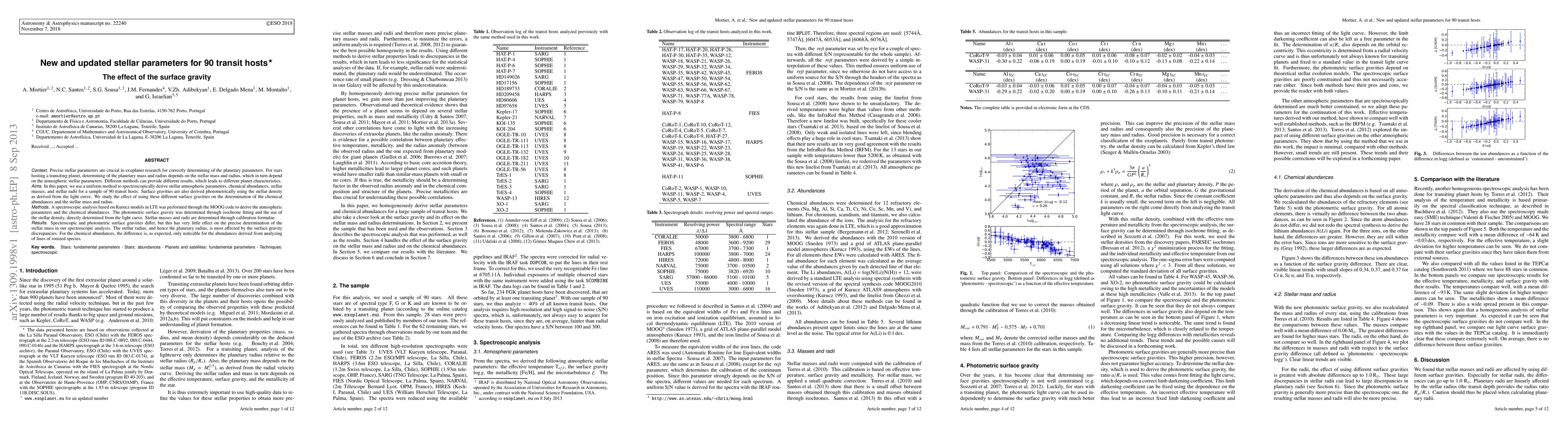 Context. Precise stellar parameters are crucial in exoplanet research for correctly determining of the planetary parameters. For stars hosting a transiting planet, determining of the planetary mass and radius depends on the stellar mass and radius, which in turn depend on the atmospheric stellar parameters. Different methods can provide different results, which leads to different planet characteristics.}%Spectroscopic surface gravities have shown to be poorly constrained, but the photometry of the transiting planet can provide an independent measurement of the surface gravity. Aims. In this paper, we use a uniform method to spectroscopically derive stellar atmospheric parameters, chemical abundances, stellar masses, and stellar radii for a sample of 90 transit hosts. Surface gravities are also derived photometrically using the stellar density as derived from the light curve. We study the effect of using these different surface gravities on the determination of the chemical abundances and the stellar mass and radius. Methods. A spectroscopic analysis based on Kurucz models in LTE was performed through the MOOG code to derive the atmospheric parameters and the chemical abundances. The photometric surface gravity was determined through isochrone fitting and the use of the stellar density, directly determined from the light curve. Stellar masses and radii are determined through calibration formulae. Results. Spectroscopic and photometric surface gravities differ, but this has very little effect on the precise determination of the stellar mass in our spectroscopic analysis. The stellar radius, and hence the planetary radius, is most affected by the surface gravity discrepancies. For the chemical abundances, the difference is, as expected, only noticable for the abundances derived from analyzing of lines of ionized species.