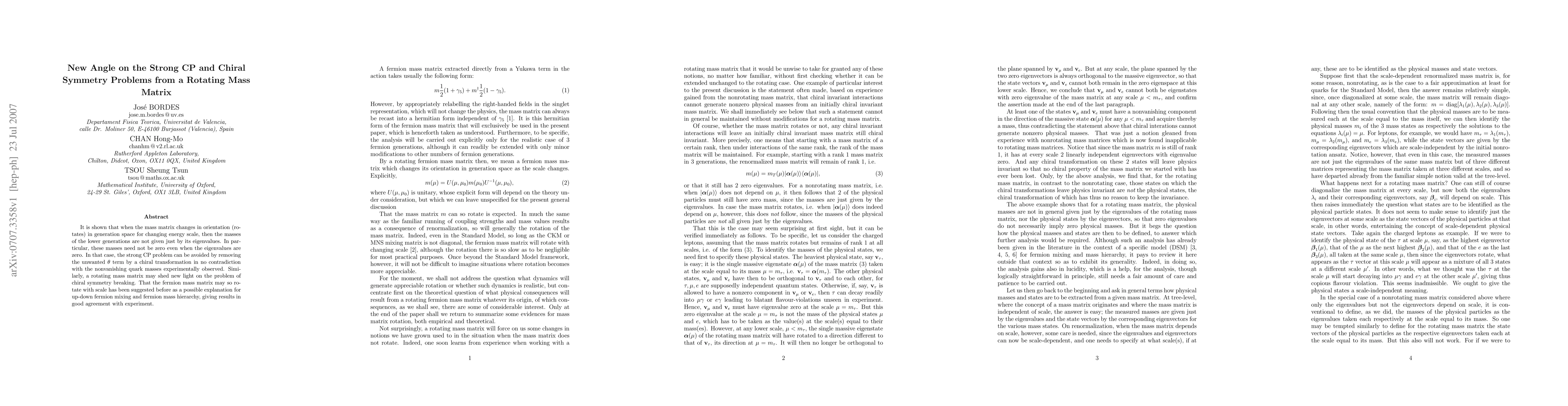 It is shown that when the mass matrix changes in orientation (rotates) in generation space for changing energy scale, then the masses of the lower generations are not given just by its eigenvalues. In particular, these masses need not be zero even when the eigenvalues are zero. In that case, the strong CP problem can be avoided by removing the unwanted $\theta$ term by a chiral transformation in no contradiction with the nonvanishing quark masses experimentally observed. Similarly, a rotating mass matrix may shed new light on the problem of chiral symmetry breaking. That the fermion mass matrix may so rotate with scale has been suggested before as a possible explanation for up-down fermion mixing and fermion mass hierarchy, giving results in good agreement with experiment.