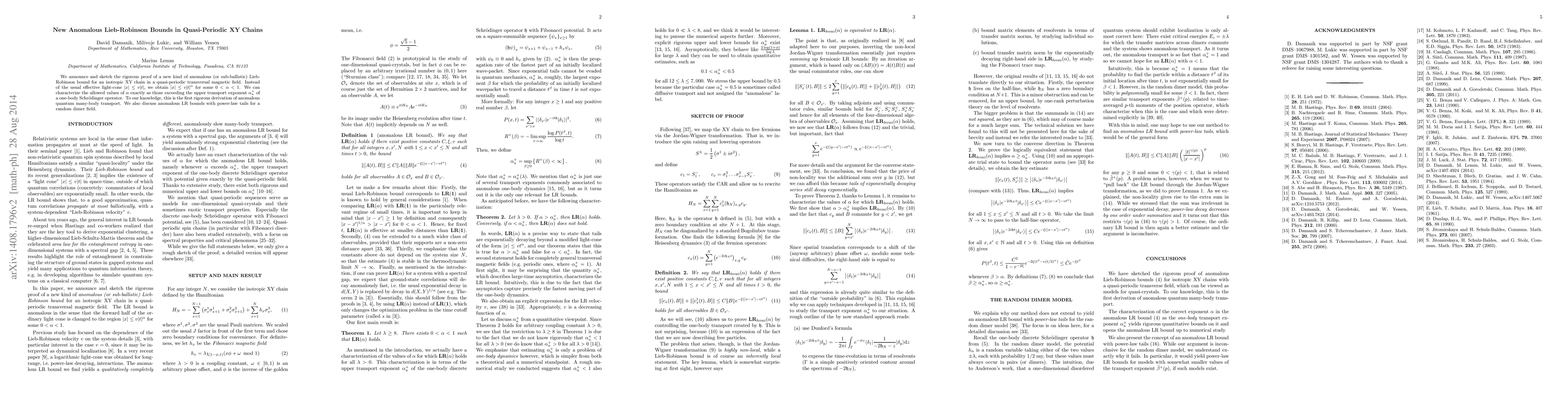 We announce and sketch the rigorous proof of a new kind of anomalous (or sub-ballistic) Lieb-Robinson bound for an isotropic XY chain in a quasi-periodic transversal magnetic field. By "anomalous", we mean that the usual effective light cone defined by $|x|\leq v|t|$ is replaced by the region $|x|\leq v|t|^\alpha$ for some $0<\alpha<1$. In fact, we can characterize exactly the values of $\alpha$ for which this holds as those exceeding the upper transport exponent $\alpha_u^+$ of an appropriate one-body discrete Schr\"odinger operator. Previous study has produced a good amount of quantitative information on $\alpha_u^+$. The result is obtained by mapping to free fermions, obtaining good dynamical bounds on the one-body level by adapting techniques developed by Damanik, Gorodetski, Tcheremchantsev, and Yessen and then "pulling back" these bounds through the non-local Jordan-Wigner transformation, following an idea of Hamza, Sims, and Stolz. To our knowledge, this is the first rigorous derivation of anomalous many-body transport. We also explain why our method does not extend to yield anomalous LR bounds of power-law type if one replaces the quasi-periodic field by a random dimer field.