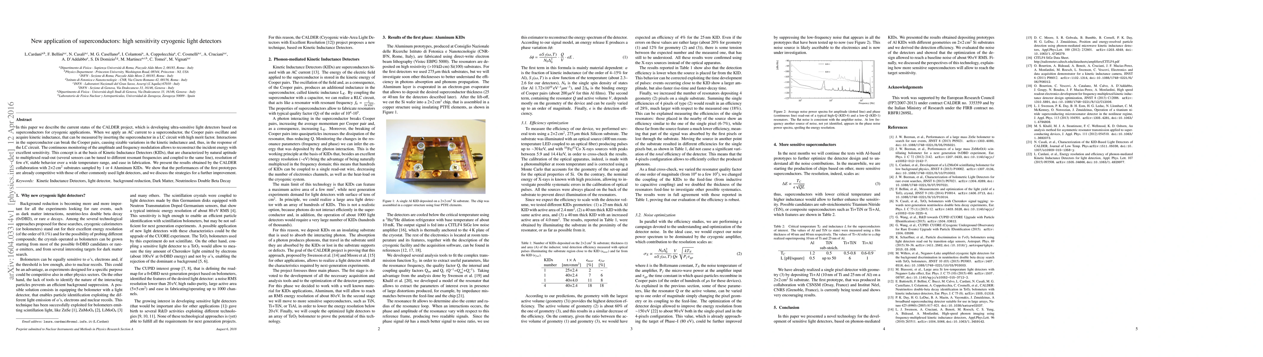 In this paper we describe the current status of the CALDER project, which is developing ultra-sensitive light detectors based on superconductors for cryogenic applications. When we apply an AC current to a superconductor, the Cooper pairs oscillate and acquire kinetic inductance, that can be measured by inserting the superconductor in a LC circuit with high merit factor. Interactions in the superconductor can break the Cooper pairs, causing sizable variations in the kinetic inductance and, thus, in the response of the LC circuit. The continuous monitoring of the amplitude and frequency modulation allows to reconstruct the incident energy with excellent sensitivity. This concept is at the basis of Kinetic Inductance Detectors (KIDs), that are characterized by natural aptitude to multiplexed read-out (several sensors can be tuned to different resonant frequencies and coupled to the same line), resolution of few eV, stable behavior over a wide temperature range, and ease in fabrication. We present the results obtained by the CALDER collaboration with 2x2 cm2 substrates sampled by 1 or 4 Aluminum KIDs. We show that the performances of the first prototypes are already competitive with those of other commonly used light detectors, and we discuss the strategies for a further improvement.