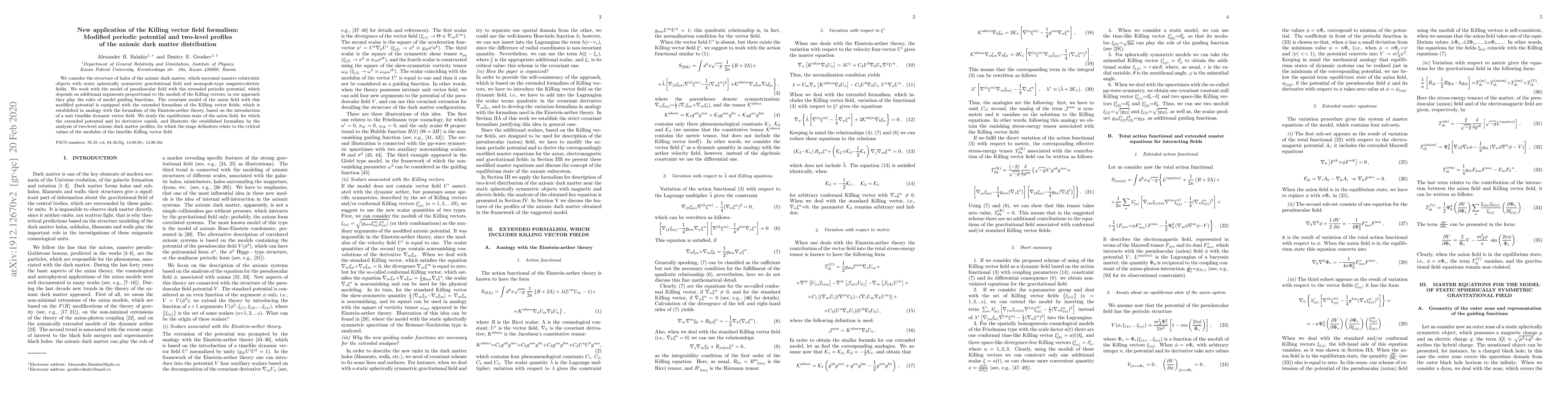 We consider the structure of halos of the axionic dark matter, which surround massive relativistic objects with static spherically symmetric gravitational field and monopole-type magneto-electric fields. We work with the model of pseudoscalar field with the extended periodic potential, which depends on additional arguments proportional to the moduli of the Killing vectors; in our approach they play the roles of model guiding functions. The covariant model of the axion field with this modified potential is equipped with the extended formalism of the Killing vector fields, which is established in analogy with the formalism of the Einstein-aether theory, based on the introduction of a unit timelike dynamic vector field. We study the equilibrium state of the axion field, for which the extended potential and its derivative vanish, and illustrate the established formalism by the analysis of two-level axionic dark matter profiles, for which the stage delimiters relate to the critical values of the modulus of the timelike Killing vector field.