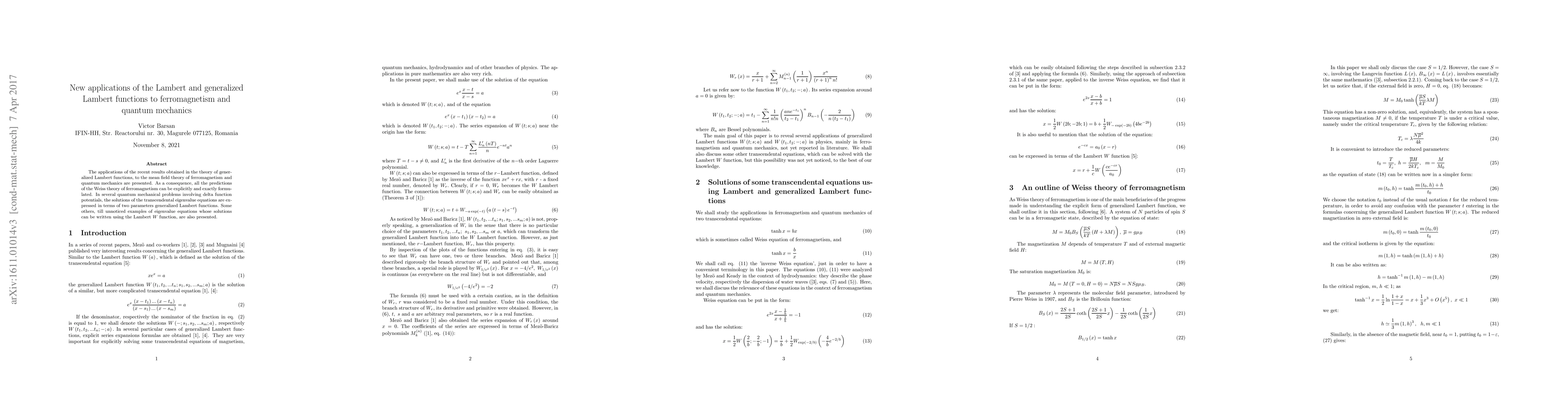 This paper applies generalized Lambert functions to refine the mean field theory of ferromagnetism, providing exact formulations of Weiss theory predictions. It also utilizes these functions to solve transcendental eigenvalue equations in quantum mechanics, particularly in delta function potential problems.