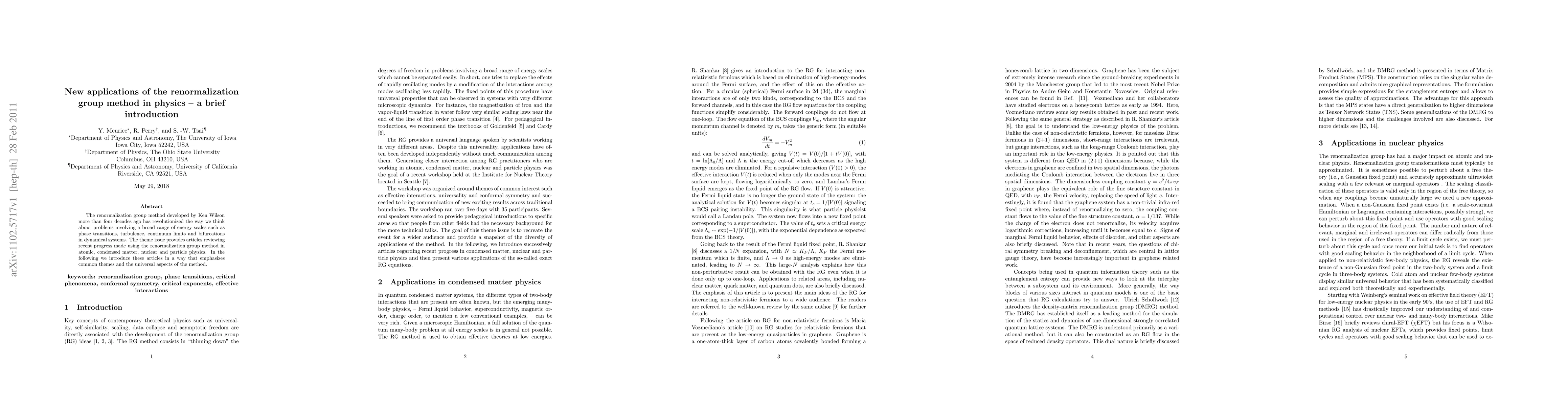 The renormalization group method, originally developed by Ken Wilson, has transformed our understanding of complex systems across various energy scales. This paper introduces recent advancements in its applications across atomic, condensed matter, nuclear, and particle physics, highlighting universal principles and common themes.