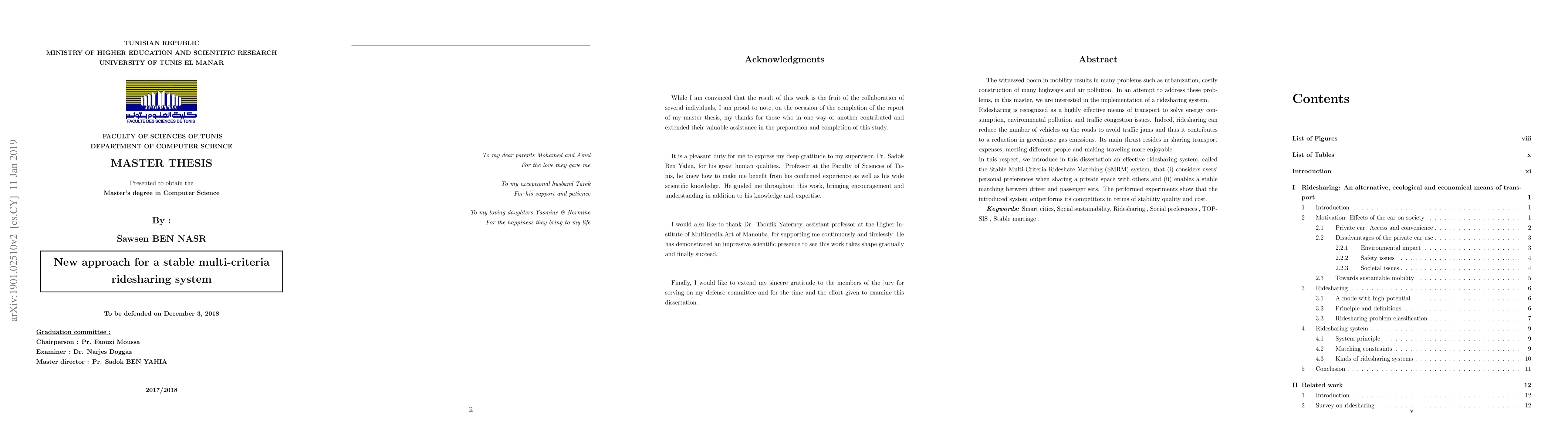 The witnessed boom in mobility results in many problems such as urbanization, costly construction of many highways and air pollution. In an attempt to address these problems, in this master, we are interested in the implementation of a ridesharing system. Ridesharing is recognized as a highly effective means of transport to solve energy consumption, environmental pollution and traffic congestion issues. Indeed, ridesharing can reduce the number of vehicles on the roads to avoid traffic jams and thus it contributes to a reduction in greenhouse gas emissions. Its main thrust resides in sharing transport expenses, meeting different people and making traveling more enjoyable. In this respect, we introduce in this dissertation an effective ridesharing system, called the Stable Multi-Criteria Rideshare Matching (SMRM) system, that (i) considers users' personal preferences when sharing a private space with others and (ii) enables a stable matching between driver and passenger sets. The performed experiments show that the introduced system outperforms its competitors in terms of stability quality and cost. Keywords: Smart cities, Social sustainability, Ridesharing , Social preferences , TOPSIS , Stable marriage .