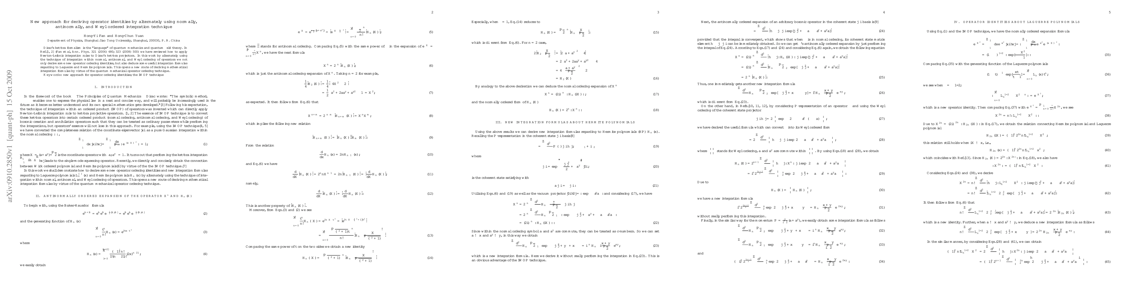 Dirac's ket-bra formalism is the "language" of quantum mechanics and quantum field theory. In Refs.(Fan et al, Ann. Phys. 321 (2006) 480; 323 (2008) 500) we have reviewed how to apply Newton-Leibniz integration rules to Dirac's ket-bra projectors. In this work by alternately using the technique of integration within normal, antinormal, and Weyl ordering of operators we not only derive some new operator ordering identities, but also deduce some useful integration formulas regarding to Laguerre and Hermite polynomials. This opens a new route of deriving mathematical integration formulas by virtue of the quantum mechanical operator ordering technique.