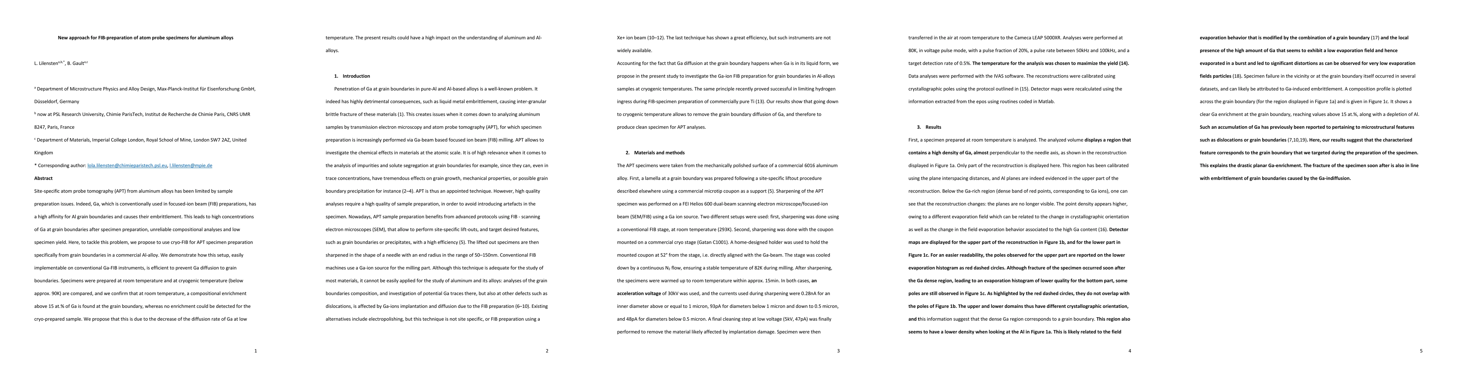 This paper proposes a cryo-focused ion beam (FIB) method for preparing atom probe tomography (APT) specimens from aluminum alloys, addressing the issue of Ga diffusion to grain boundaries caused by conventional FIB preparation. The cryo-FIB method significantly reduces Ga enrichment at grain boundaries, improving compositional analysis and specimen yield.