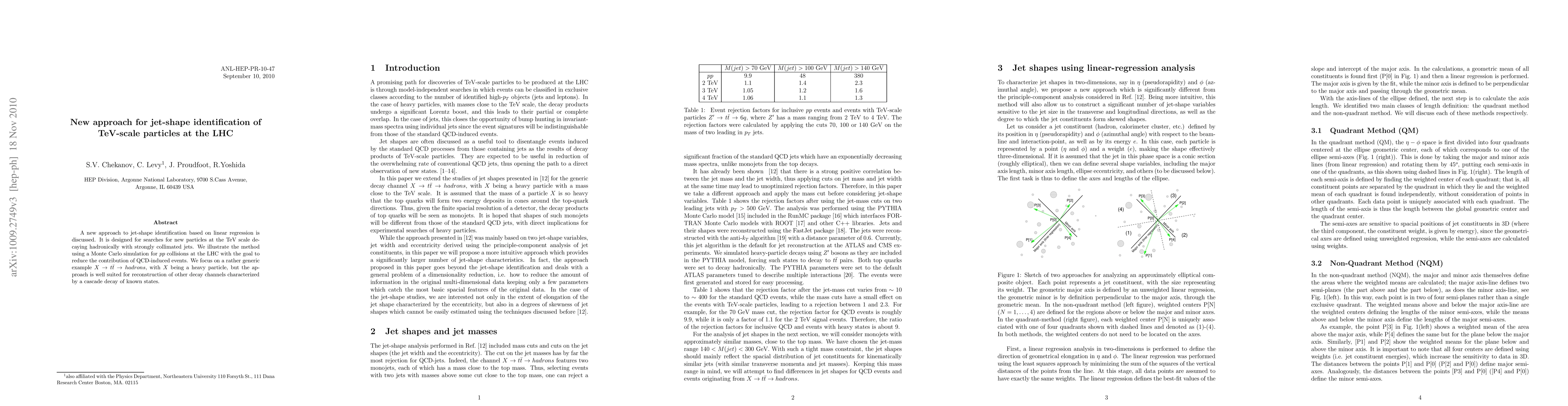 The research proposes a new approach for jet-shape identification based on linear regression, designed for TeV-scale particles in hadronic decays at the LHC, aiming to reduce QCD-induced background events.