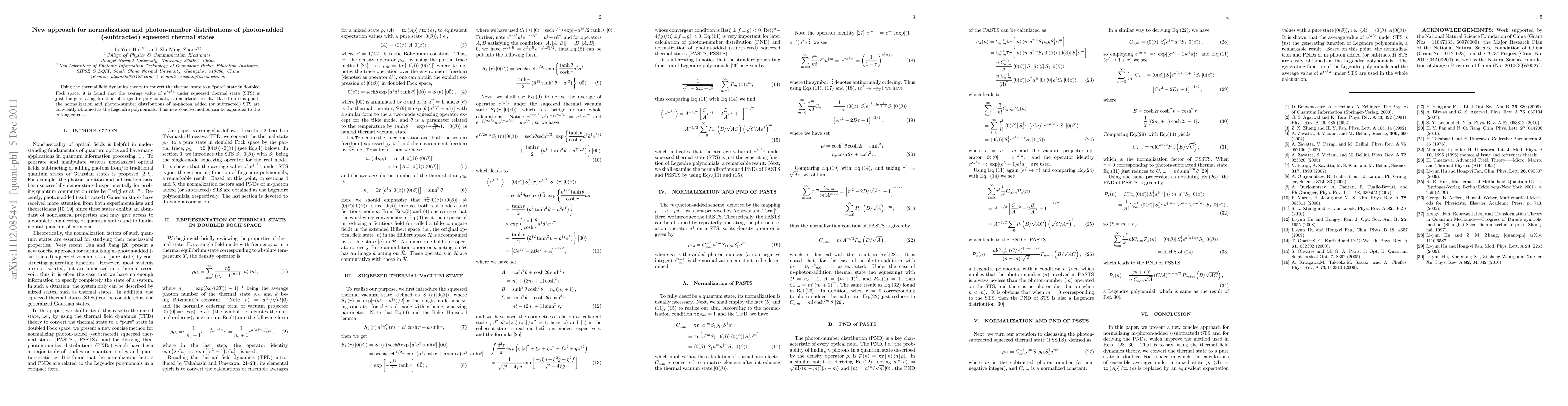 Using the thermal field dynamics theory to convert the thermal state to a "pure" state in doubled Fock space, it is found that the average value of e^{fa^{{\dag}}a} under squeezed thermal state (STS) is just the generating function of Legendre polynomials, a remarkable result. Based on this point, the normalization and photon-number distributions of m-photon added (or subtracted) STS are conviently obtained as the Legendre polynomials. This new concise method can be expanded to the entangled case.