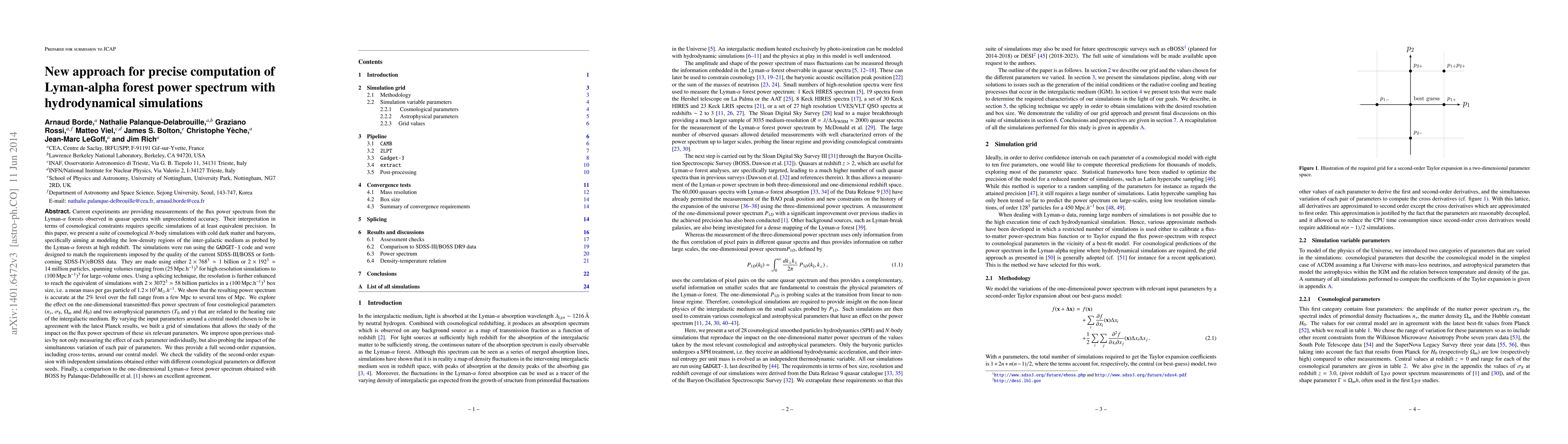 We present a suite of cosmological N-body simulations with cold dark matter and baryons aiming at modeling the low-density regions of the IGM as probed by the Lyman-$\alpha$ forests at high redshift. The simulations are designed to match the requirements imposed by the quality of BOSS and eBOSS data. They are made using either 2x768$^3$ or 2x192$^3$ particles, spanning volumes ranging from (25 Mpc.h$^{-1})^3$ for high-resolution simulations to (100 Mpc.h$^{-1})^3$ for large-volume ones. Using a splicing technique, the resolution is further enhanced to reach the equivalent of simulations with 2x3072$^3$= 58 billion particles in a (100 Mpc.h$^{-1}$)^3 box size, i.e. a mean mass per gas particle of 1.2x10$^5$M_sun.h$^{-1}$. We show that the resulting power spectrum is accurate at the 2% level over the full range from a few Mpc to several tens of Mpc. We explore the effect on the one-dimensional transmitted-flux power spectrum of 4 cosmological parameters ($n_s, \sigma_8, \Omega_m, H_0$) and 2 astrophysical parameters ($T_0, \gamma$) related to the heating rate of the IGM. By varying the input parameters around a central model chosen to be in agreement with the latest Planck results, we built a grid of simulations that allows the study of the impact on the flux power spectrum of these six relevant parameters. We improve upon previous studies by not only measuring the effect of each parameter individually, but also probing the impact of the simultaneous variation of each pair of parameters. We thus provide a full second-order expansion, including cross-terms, around our central model. We check the validity of the second-order expansion with independent simulations obtained either with different cosmological parameters or different seeds. Finally, a comparison to the one-dimensional Ly-$\alpha$ forest power spectrum obtained with BOSS shows an excellent agreement.