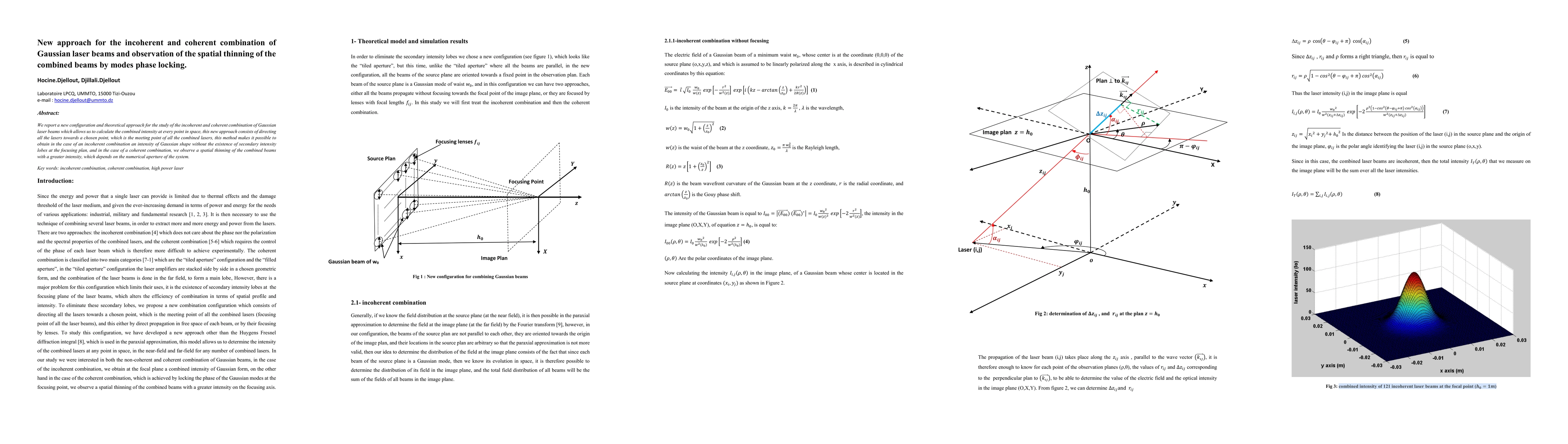 We report a new configuration and theoretical approach for the study of the incoherent and coherent combination of Gaussian laser beams which allows us to calculate the combined intensity at every point in space, this new approach consists of directing all the lasers towards a chosen point, which is the meeting point of all the combined lasers, this method makes it possible to obtain in the case of an incoherent combination an intensity of Gaussian shape without the existence of secondary intensity lobes at the focusing plan, and in the case of a coherent combination, we observe a spatial thinning of the combined beams with a greater intensity, which depends on the numerical aperture of the system.